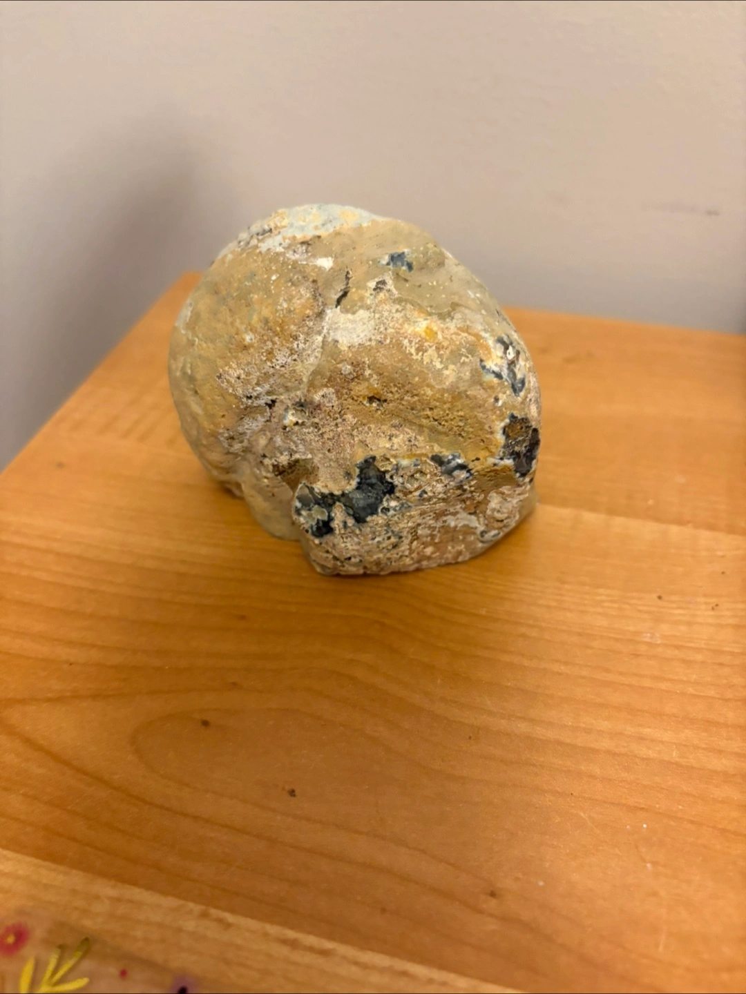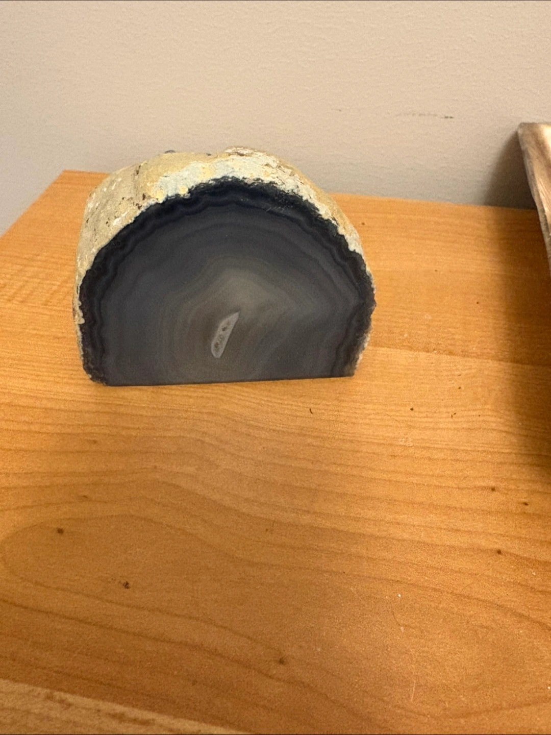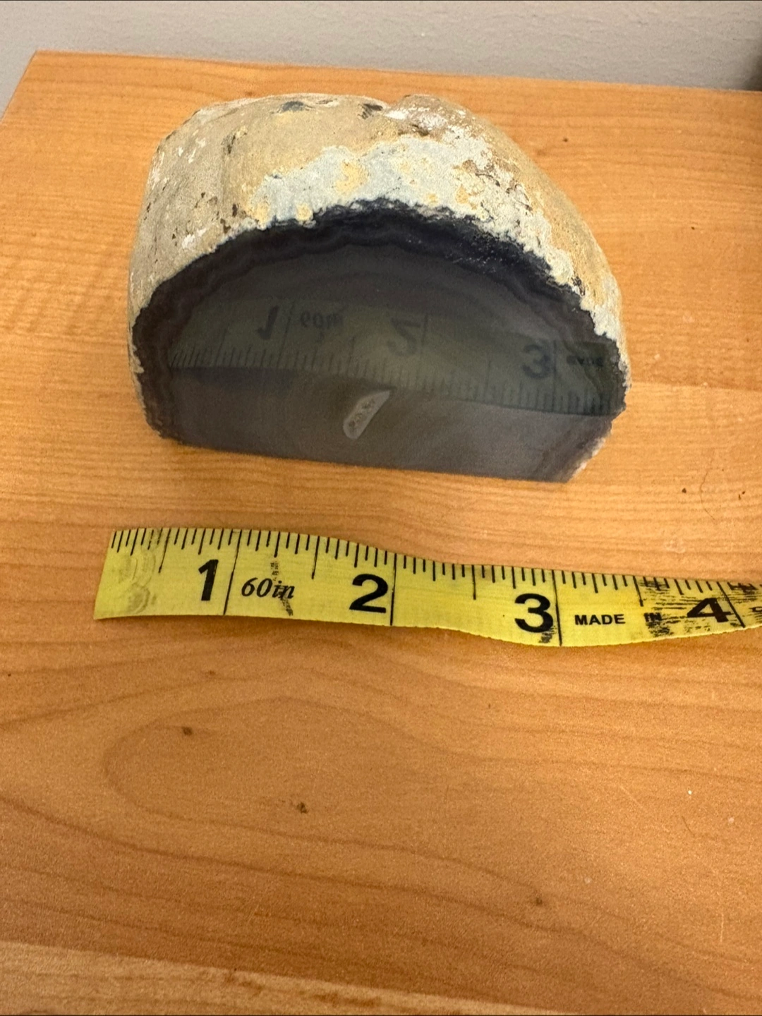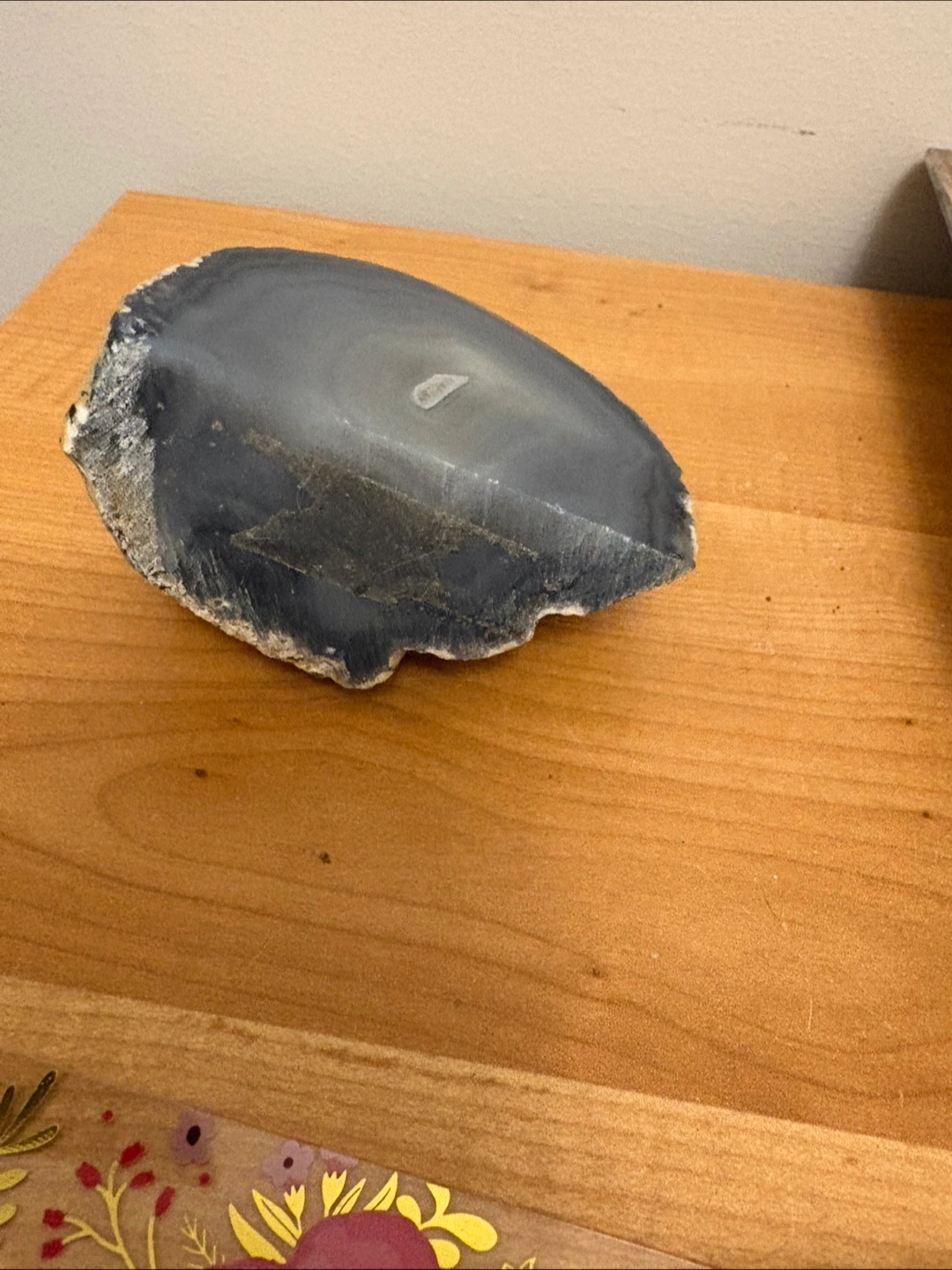 Selling a Blue agate slice. It's a beautiful piece with a unique pattern. It measures approximately 3 inches in length.
