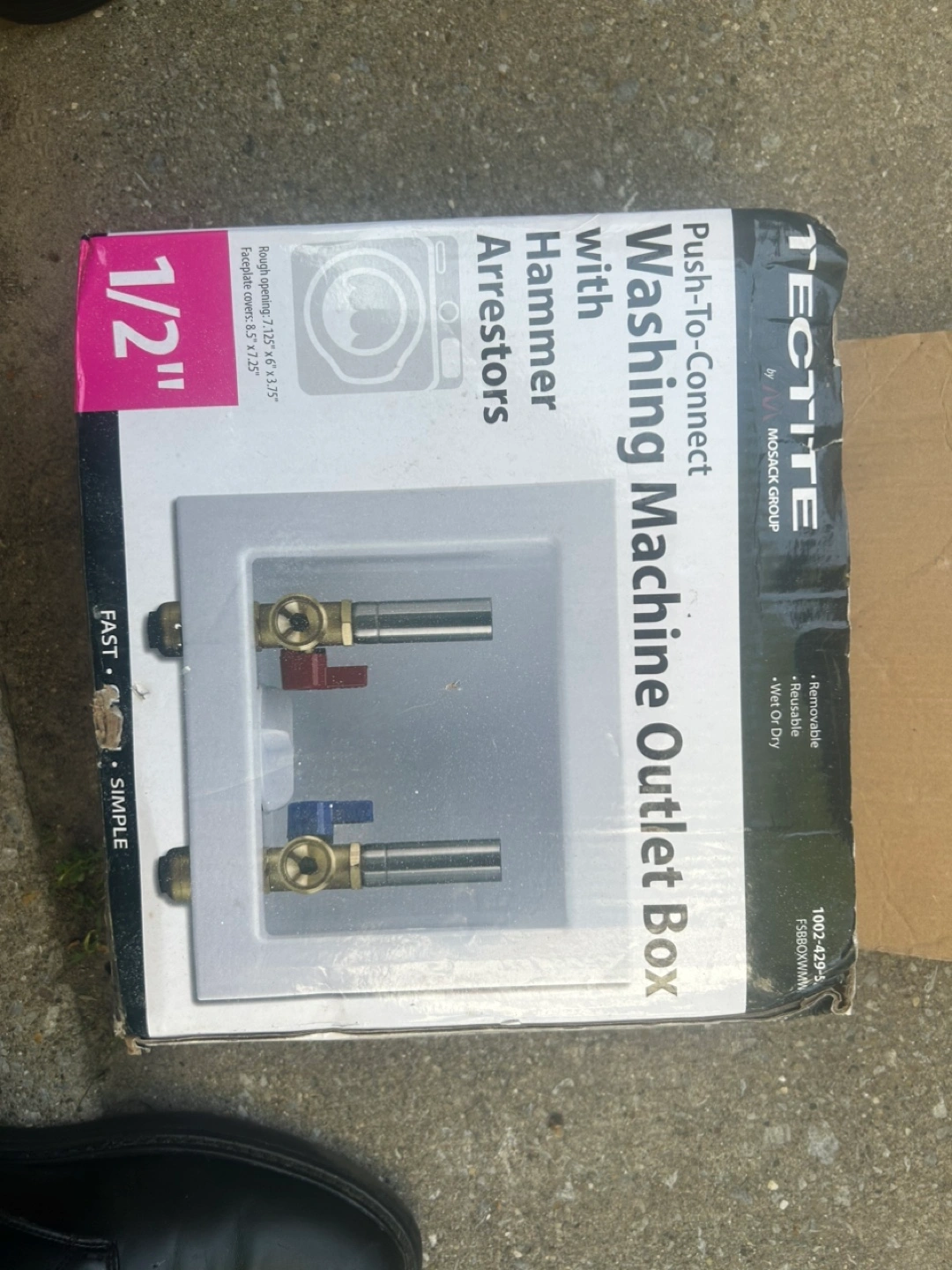 Selling a Tectite push-to-connect washing machine outlet box with hammer arrestors. It's removable, reusable, and suitable for wet or dry applications. The rough opening is 7.125" x 6" x 3.75", and the faceplate covers 8.5" x 7.25".