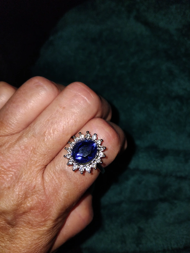 This is a ring with a blue stone surrounded by smaller clear stones. It's brand new and ready for a new home
