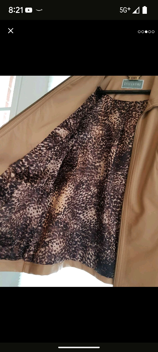 The jacket features a smooth zippered front and a unique collar design. The lining is a silky soft fabric in leopard print famous in most Guillaume leather jackets.