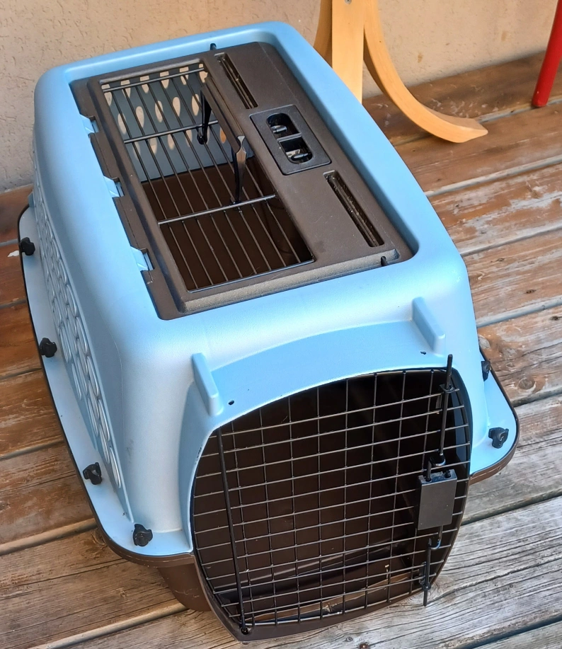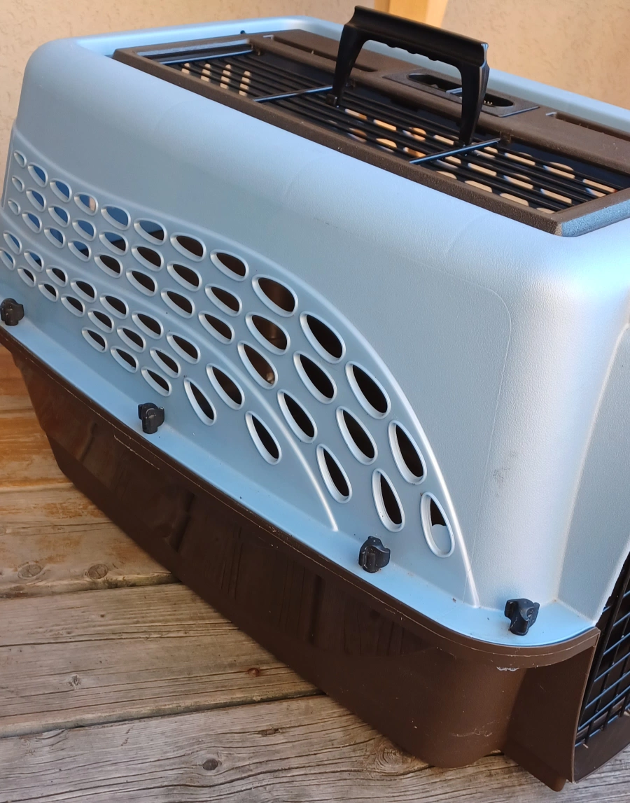 Selling a pet carrier in good condition! It's a light blue and brown colour. The door is made of metal. Perfect for taking your furry friend on trips to the vet or on vacation.