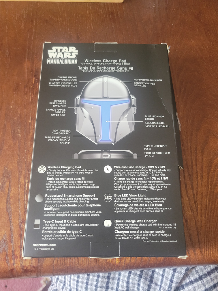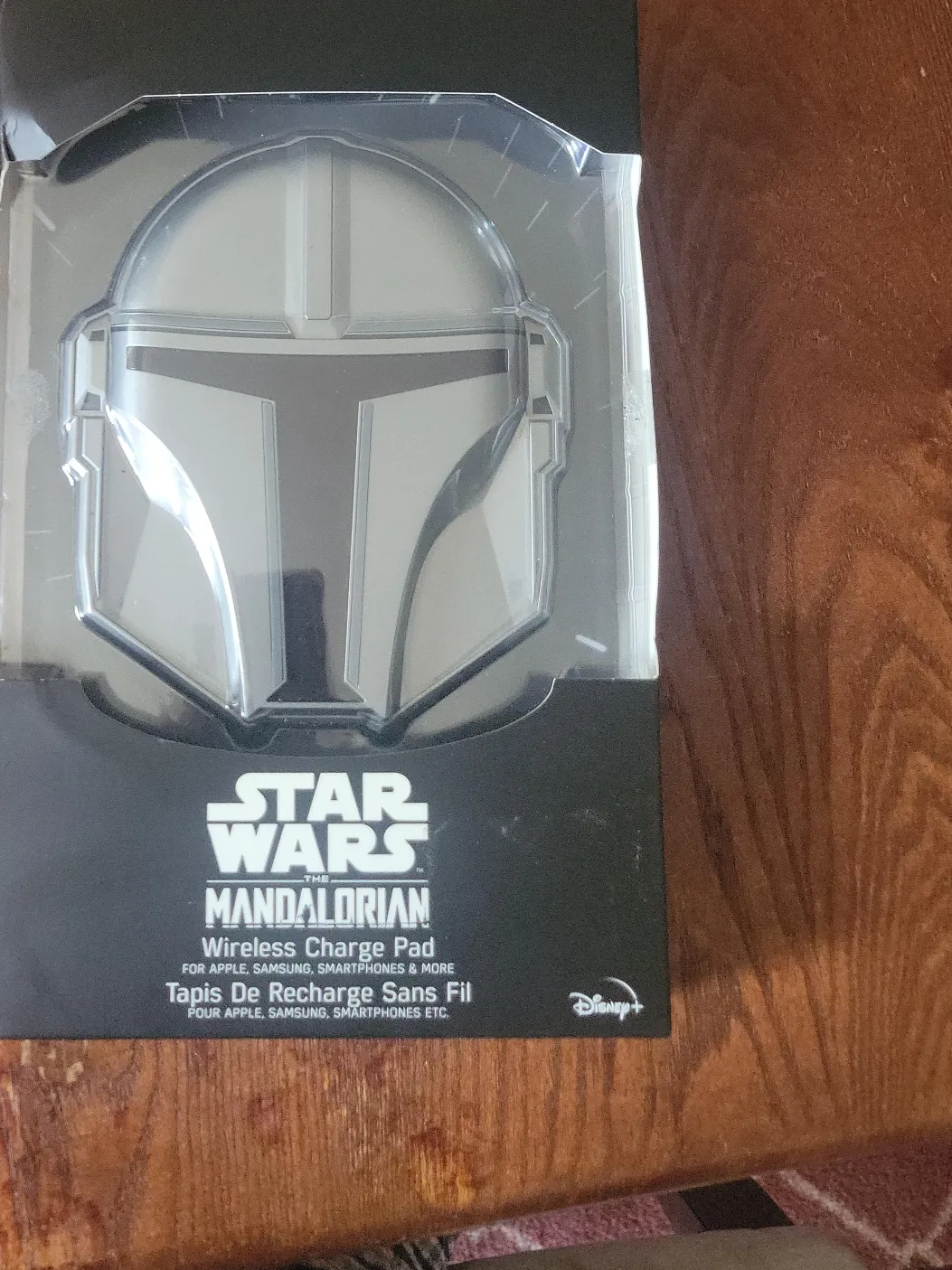 Selling a brand new Star Wars Mandalorian wireless charge pad! It's compatible with Apple, Samsung, smartphones and more. It features a highly detailed design and blue LED visor lights. It supports wireless fast charge at 10W and 7.5W. It also has a type-C input and cable included.