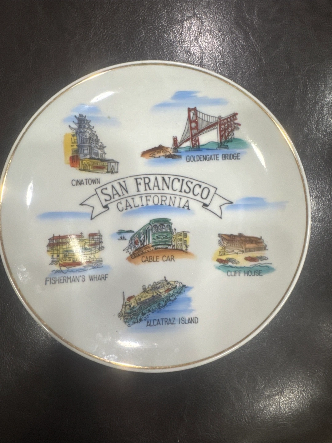 Selling a vintage decorative plate featuring San Francisco landmarks like the Golden Gate Bridge, Fisherman's Wharf, and Alcatraz Island. It's for decorative purposes only and made in Japan