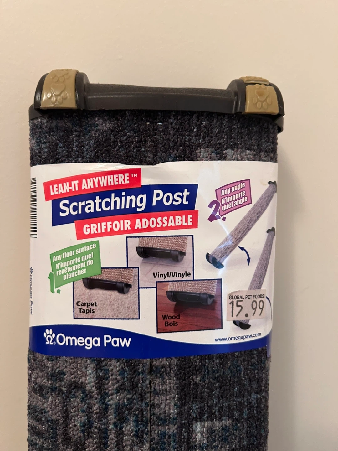 Selling an Omega Paw Lean-It Anywhere Scratching Post. This scratching post can be leaned against any wall or surface. It features both carpet and wood textures for your cat's scratching preferences. Unused. Originally bought for $15.99!