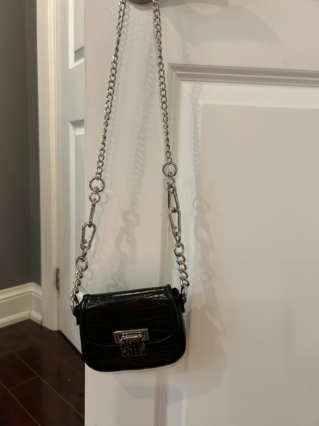 Check out this cute Steve Madden mini crossbody bag! It features a stylish black croc texture and a silver chain strap. Perfect for carrying your essentials in style!