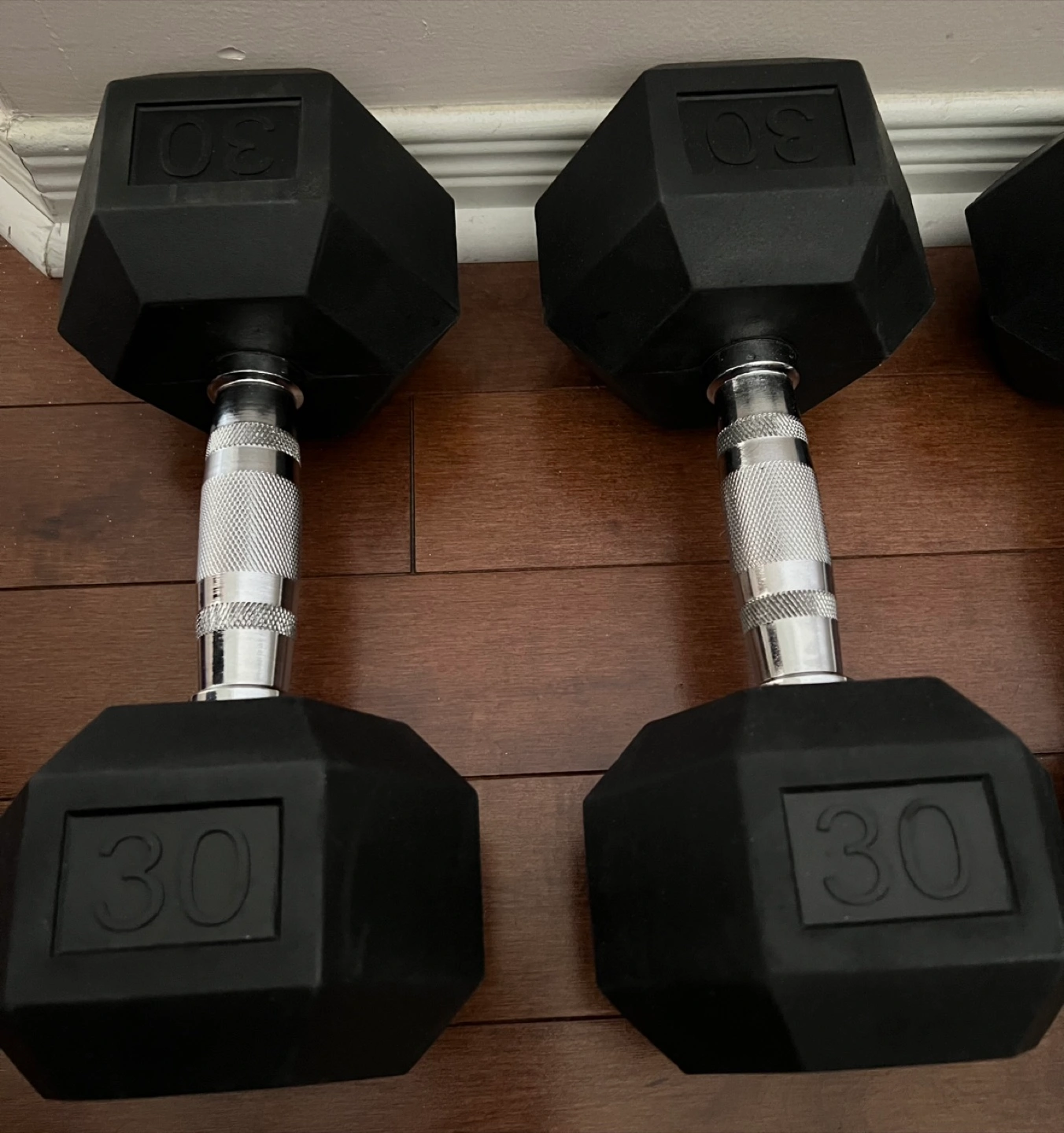 Selling a pair of 30lb hex dumbbells. They're like New and ready for your home gym! Perfect for a variety of exercises.