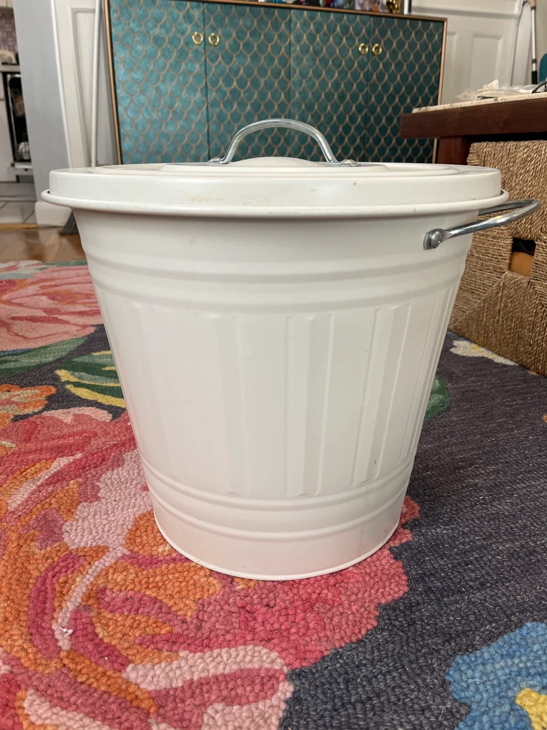 Selling a white metal trash can with a lid, perfect for composting. It's in great condition and perfect for any room in the house. The handles make it easy to move around, and the lid keeps everything tidy!