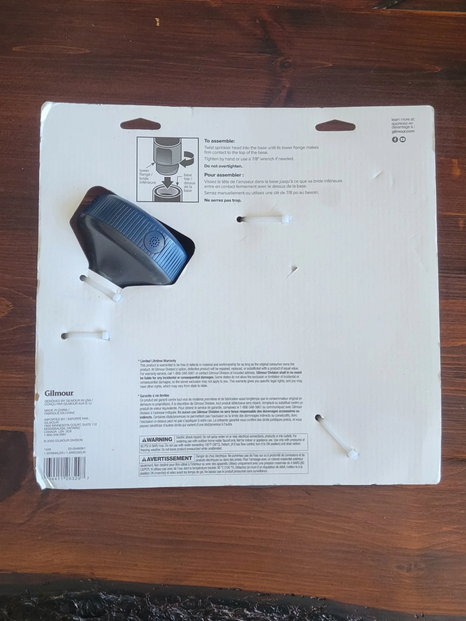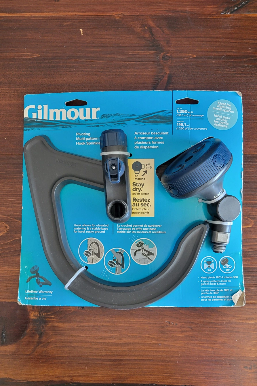 I'm selling a brand new Gilmour Multi-Pattern Pivoting Trunk Sprinkler. It's ideal for watering small spaces and can cover up to 1,250 sq ft (116.1 m²). It has a pivoting head and a hook for elevated watering and a stable base for hard, rocky ground.