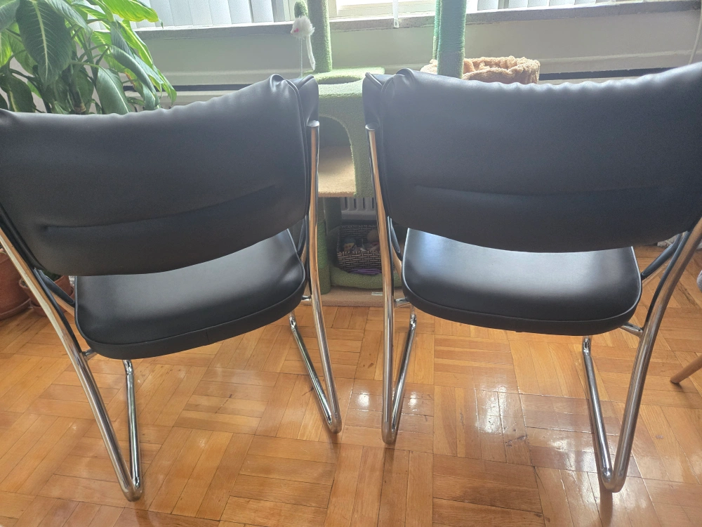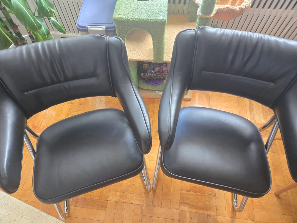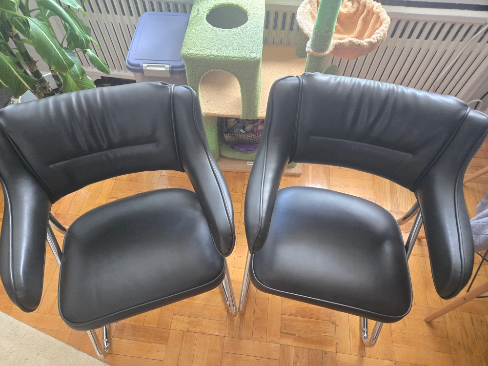 Selling a pair of stylish chairs! They feature a sleek black leather seat, back and arms, complemented by a chrome frame. These chairs would add a touch of modern elegance to any space in your home