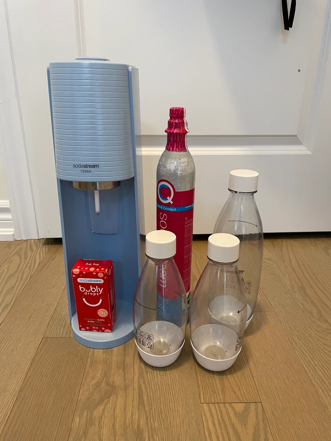 Selling a SodaStream Terra in great condition! It comes with the machine, a CO2 Quick Connect cylinder (one in machine and one extra unopened) three bottles, and a box of Bubly drops (expired) to add some flavour to your sparkling water.