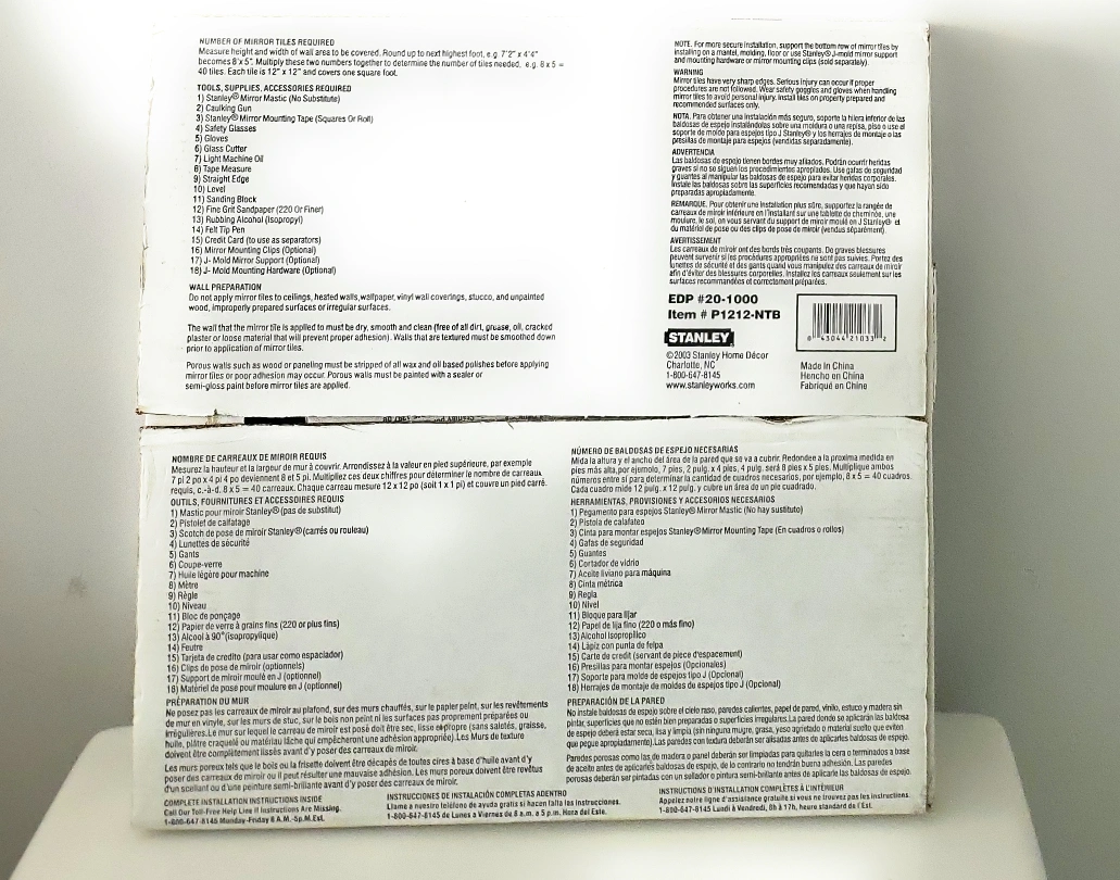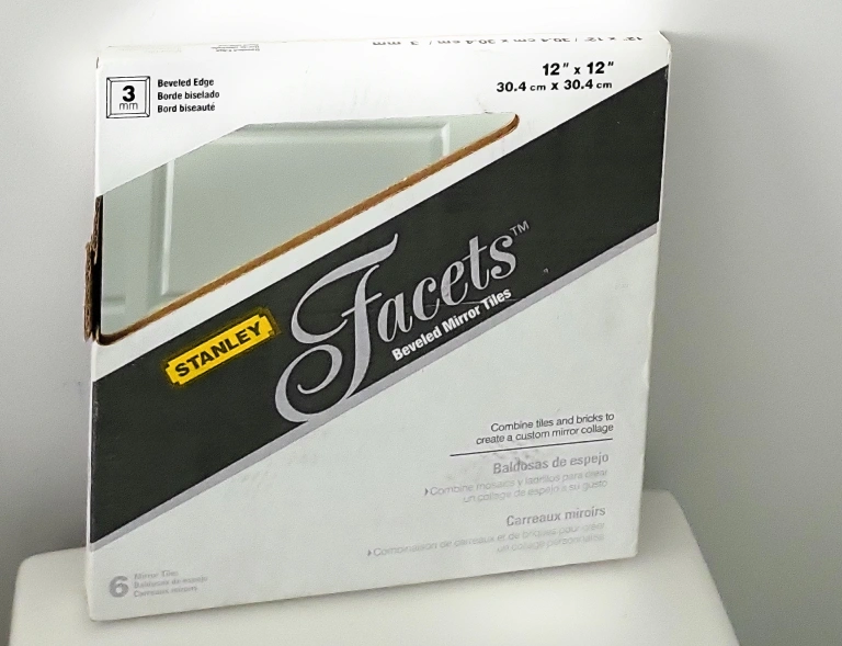 Selling a box of Stanley Facets Beveled Mirror Tiles. These are 12" x 12" (30.4 cm x 30.4 cm) tiles. Perfect for creating a custom mirror collage! The box includes 6 mirror tiles.