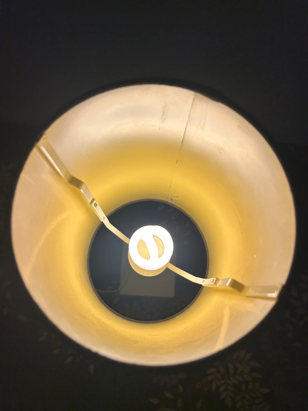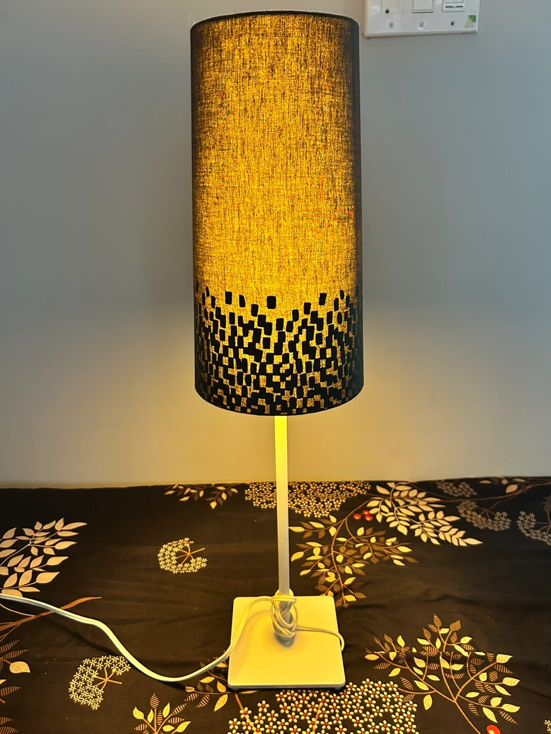 This table lamp features a stylish black and gold patterned shade that adds a touch of modern elegance to any room. It's in great condition and provides a warm, inviting light. Perfect for a bedside table or living room accent!