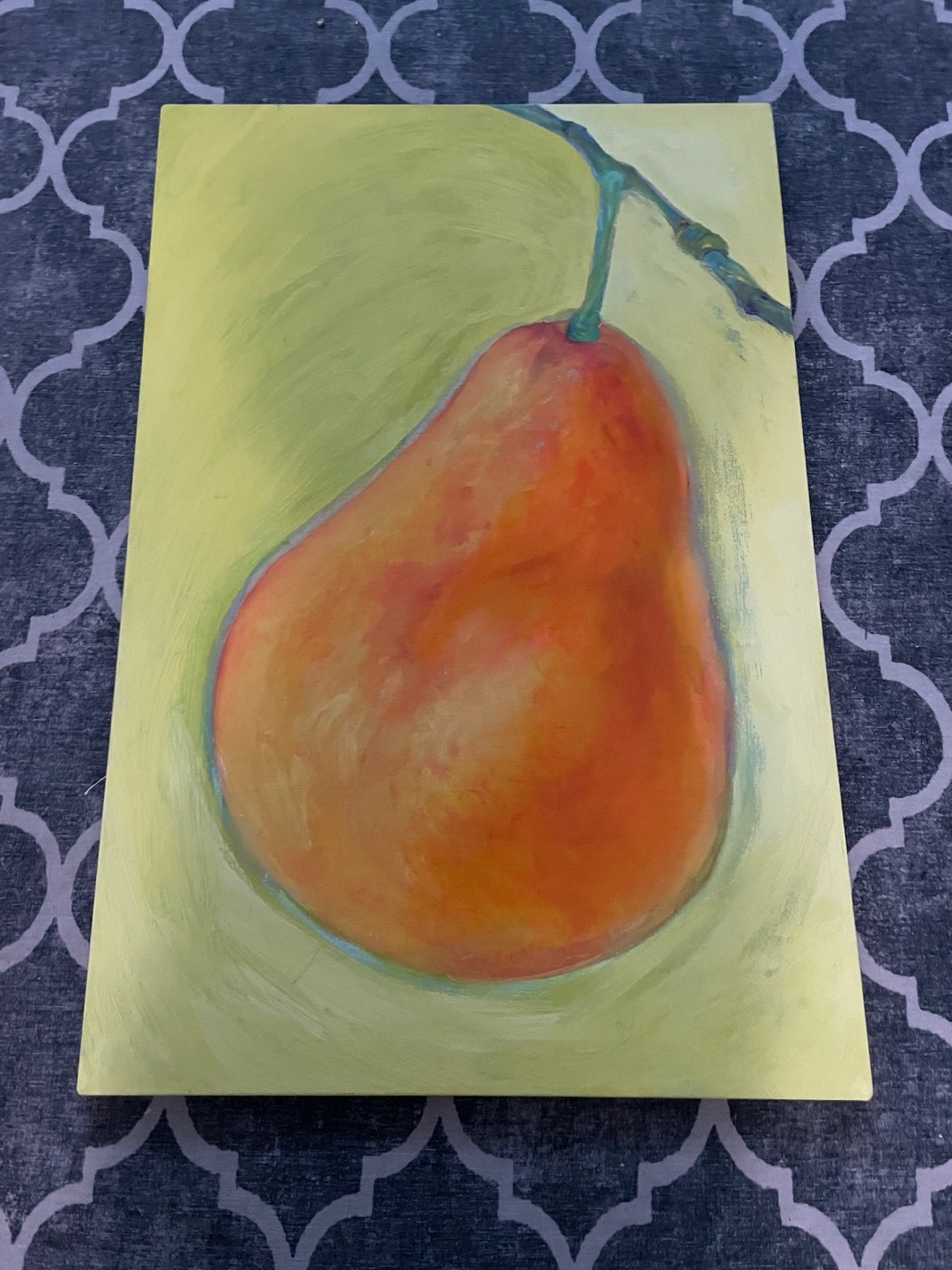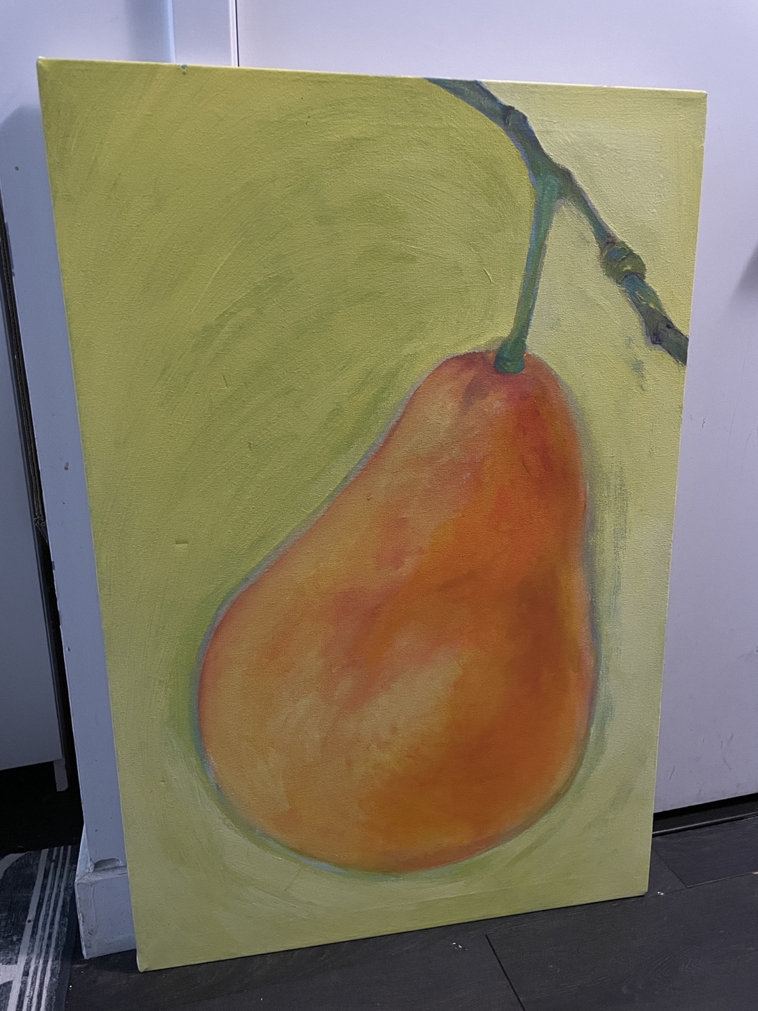 A lovely painting of a pear, perfect for adding a touch of warmth to your home. Van Gogh-inspired. By unknown Polish artist.