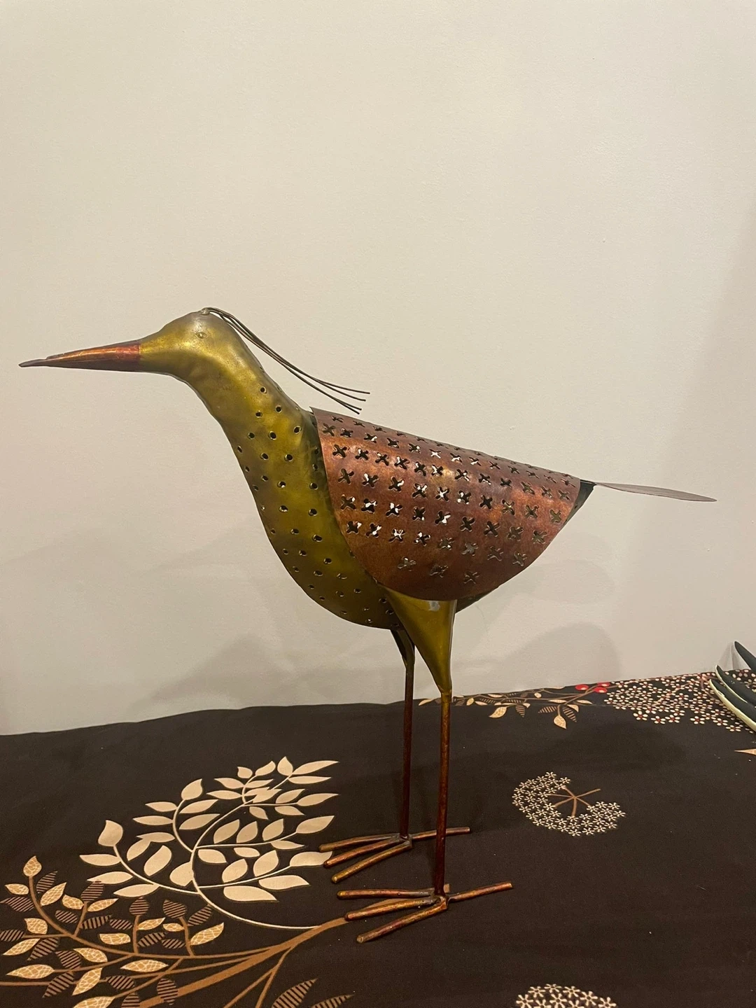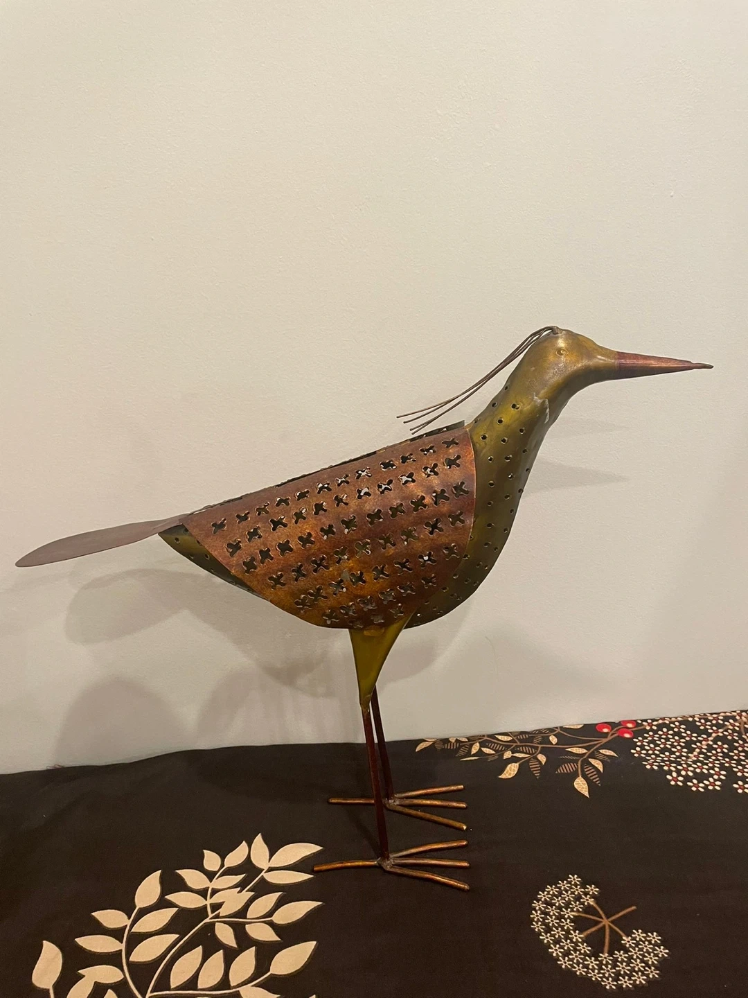 Add a unique touch to your home with this metal bird sculpture! It's in great condition and would look lovely on a shelf or table. Perfect for adding a bit of rustic charm to any room