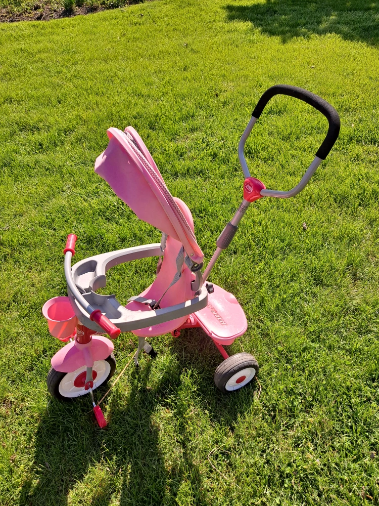 This is a Radio Flyer Steer & Stroll Trike in pink! It's perfect for little ones learning to ride. Features include a parent steering handle and a sturdy design for safe and fun adventures