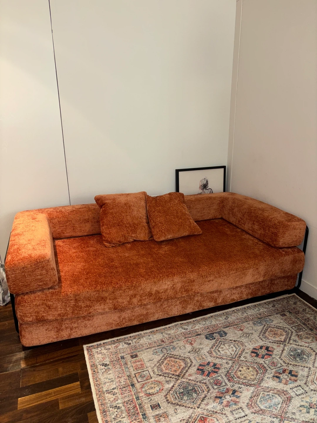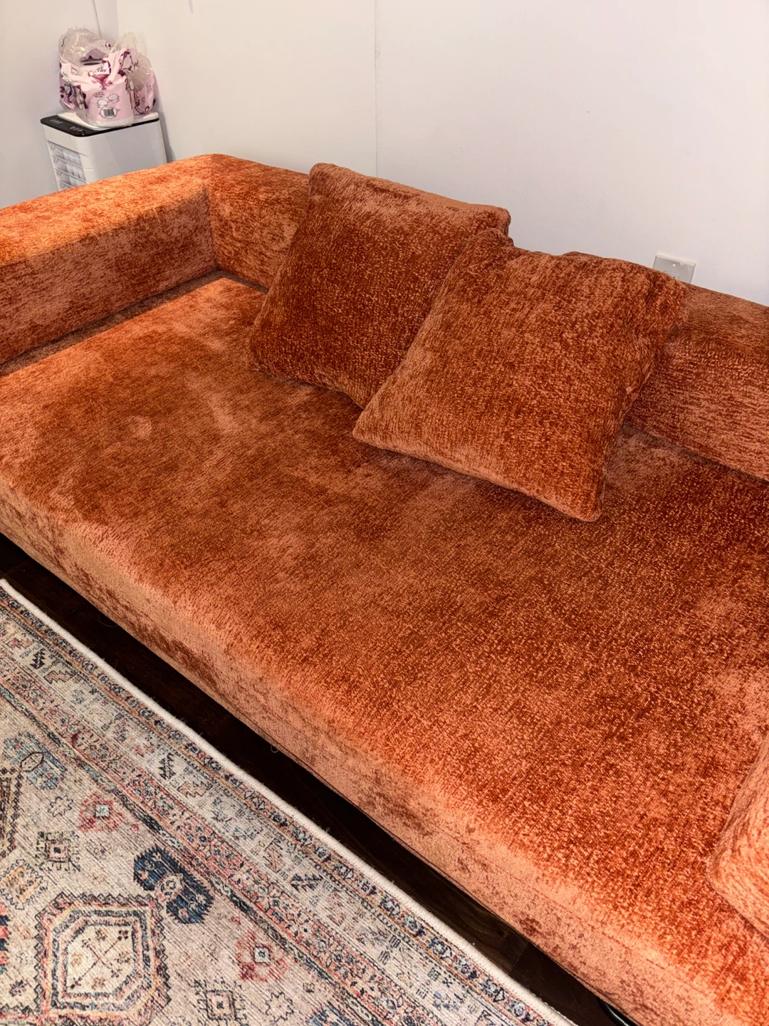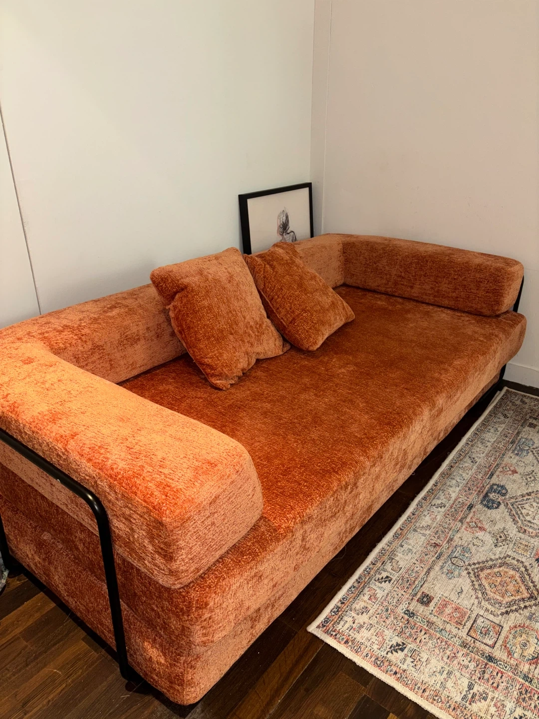 Orange velvet sofa with a black metal frame. It comes with two matching throw pillows. This couch offers a comfortable seating area with a modern design and a convertible sleeping/conversation pit area.