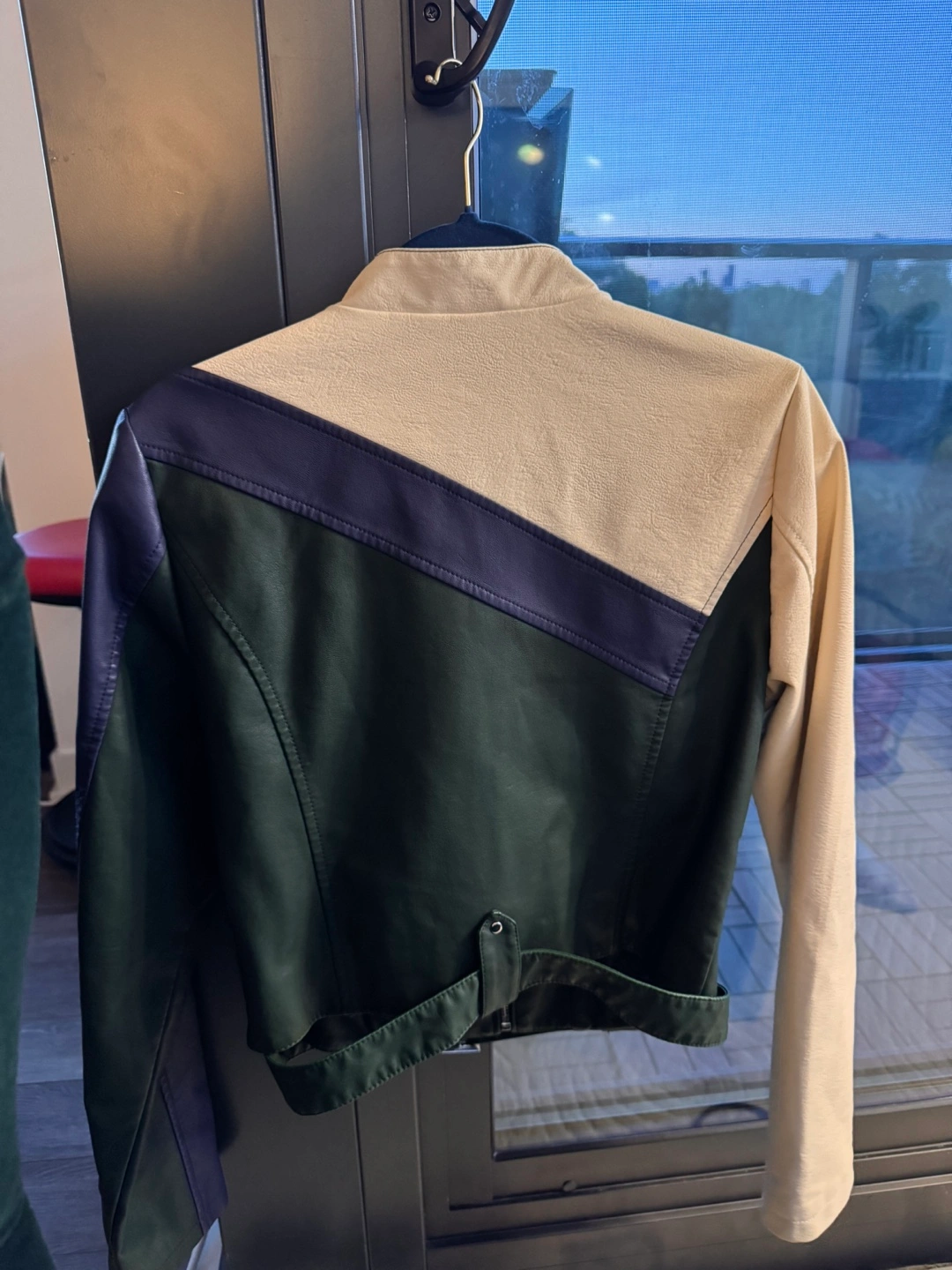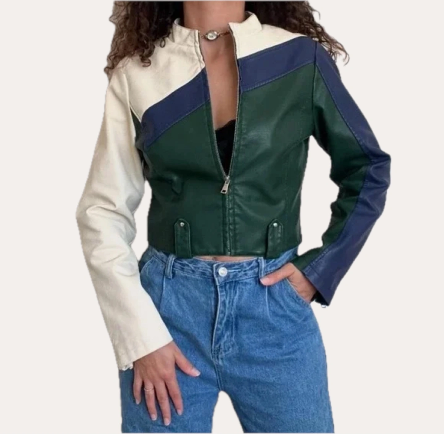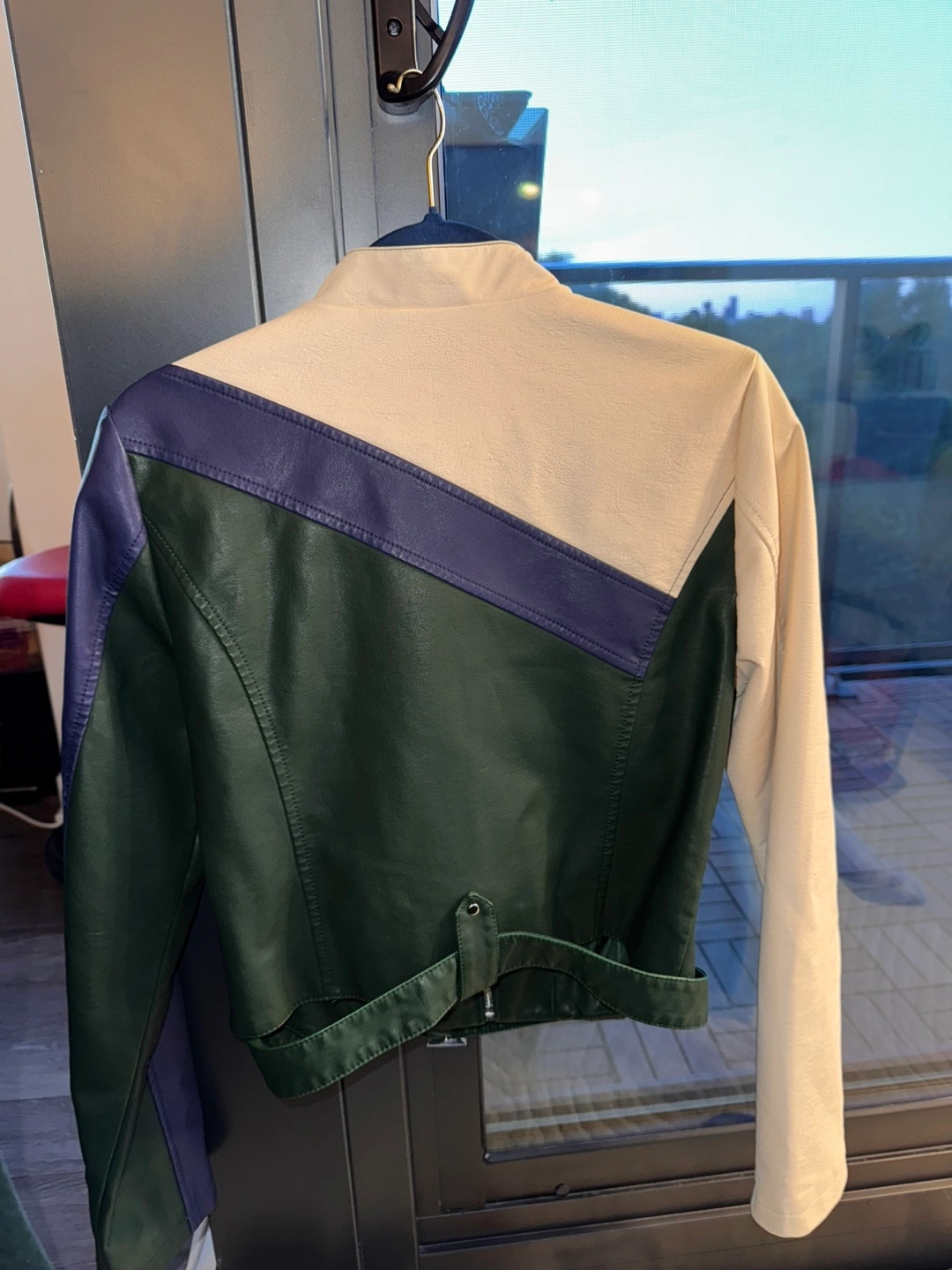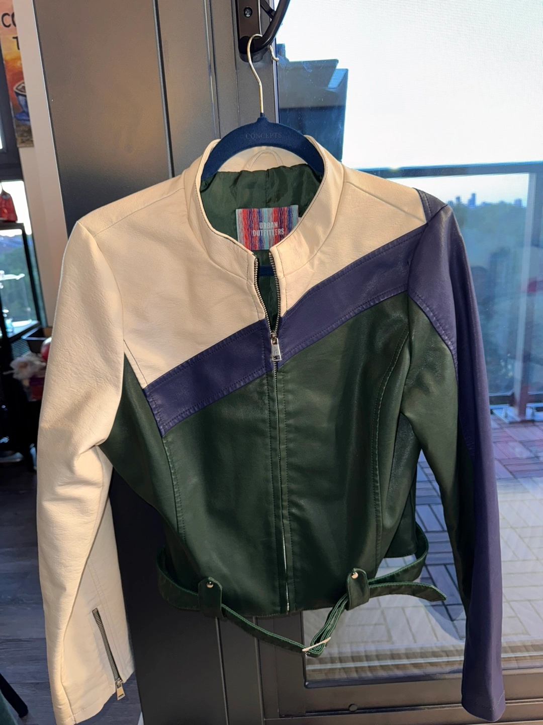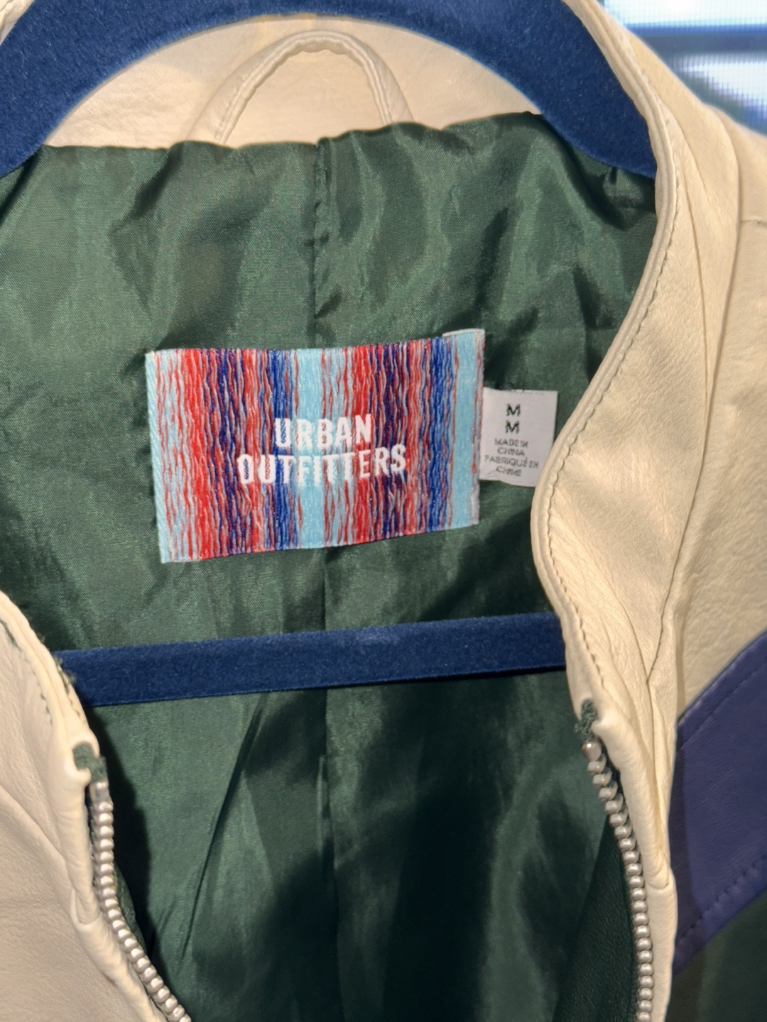 Urban Outfitters colour block faux leather jacket in a size medium! The jacket features a unique design with cream, forest green, and navy blue panels. It's made of a comfortable material, perfect for adding a stylish touch to your outfit.