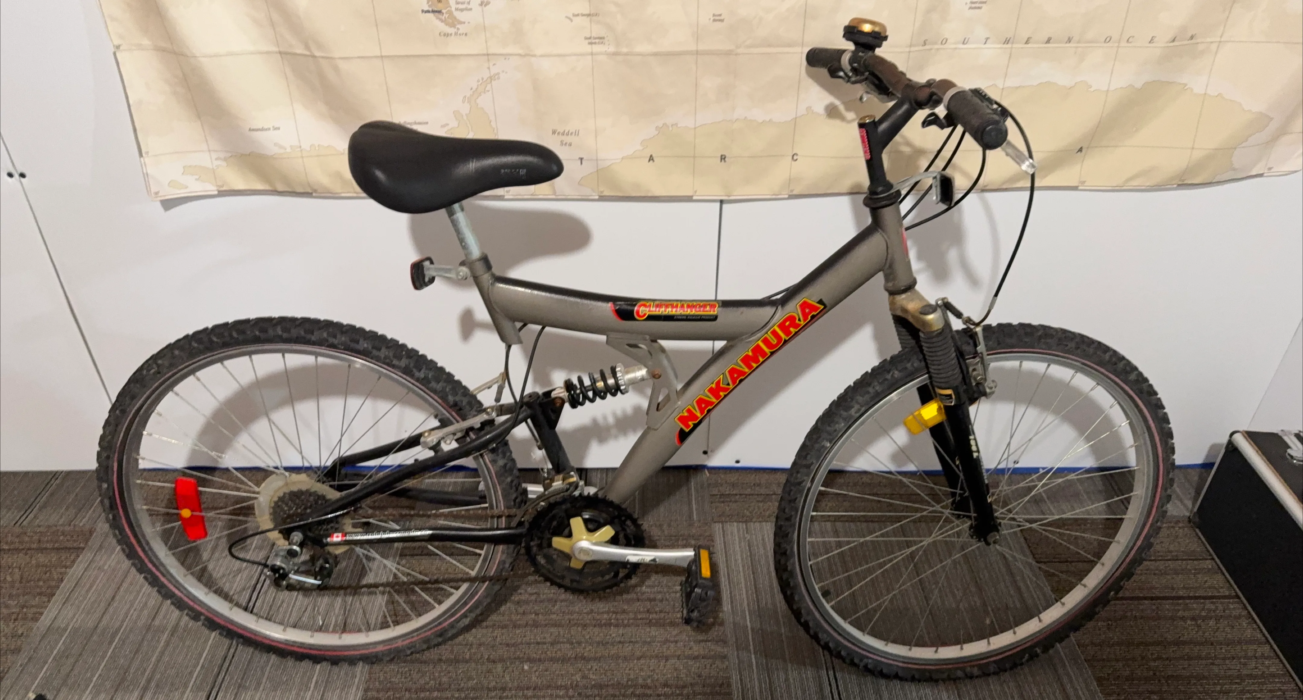 Selling a Nakamura Cliffhanger mountain bike. It has a bell and front and rear suspension. Great for trails or getting around town! With 7 gear changes!