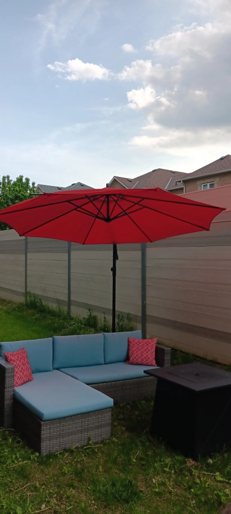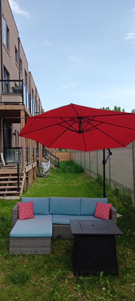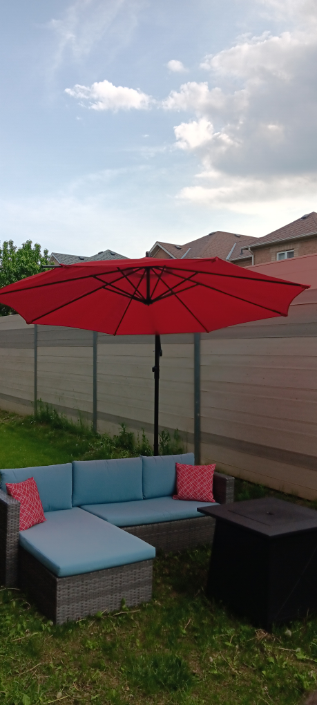 Selling a red outdoor patio umbrella. It's in great shape and ready to provide some shade for your backyard or patio during these hot sunny days! Perfect for relaxing outdoors. Sofa includes all cushions seen in photos. Umbrella has 2 stems that require fabric to be stiched at the ends otherwise it's fully functional!!