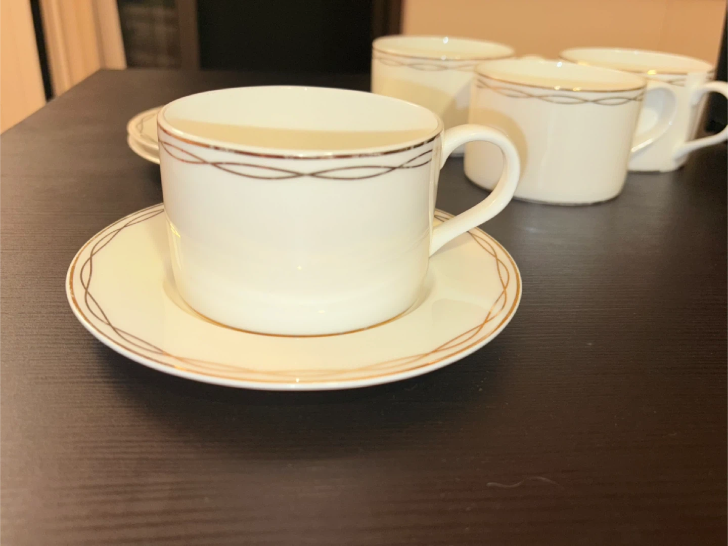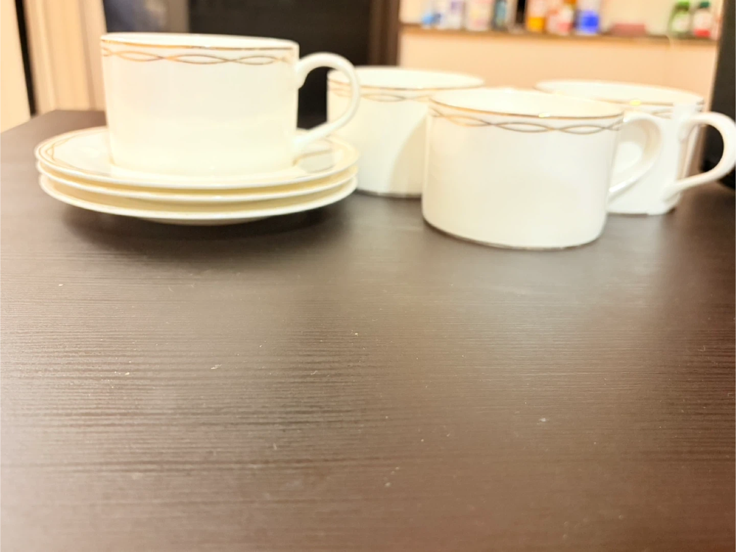 Here's a set of four lovely white cups and saucers! They have a delicate gold trim design that adds a touch of elegance to your tea or coffee time. Perfect for everyday use or special occasions!