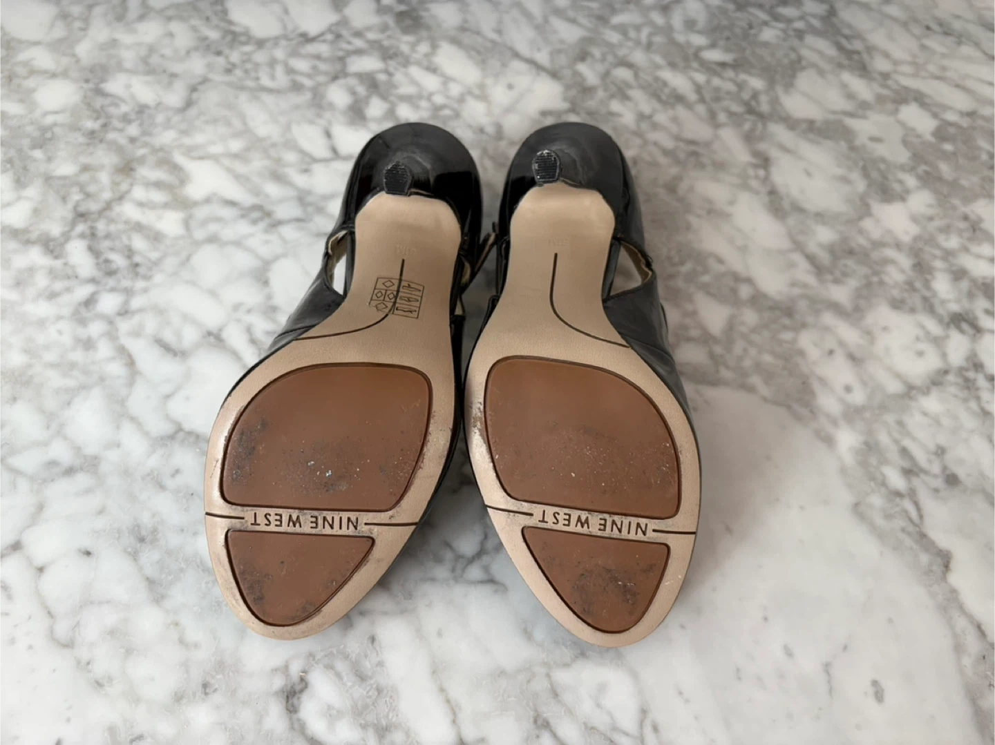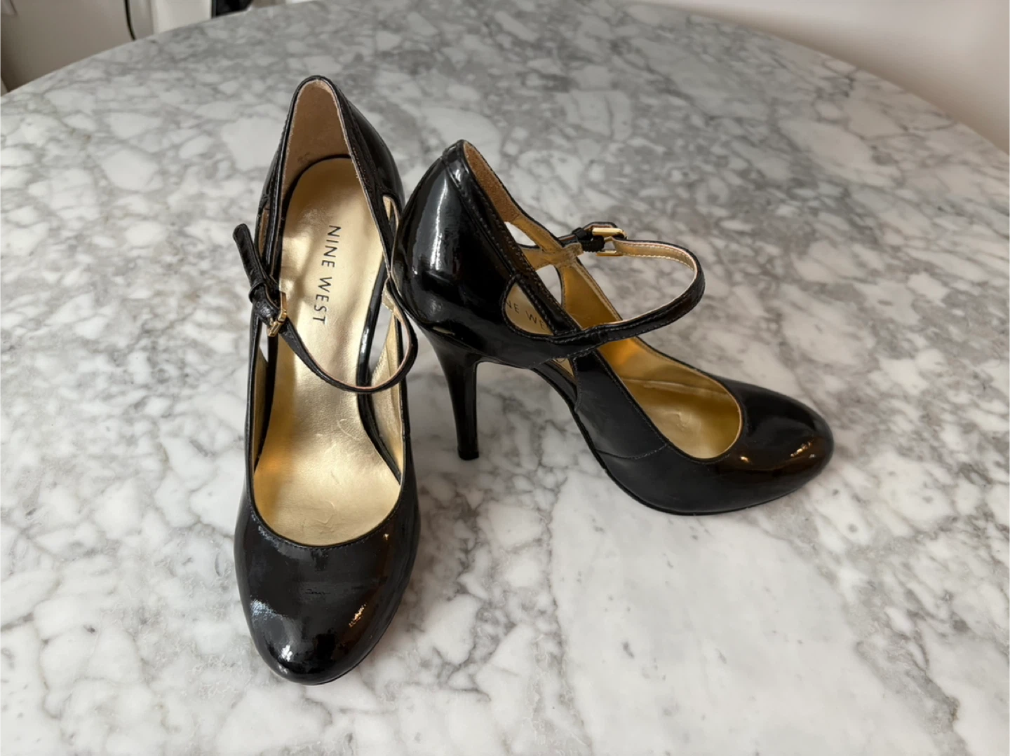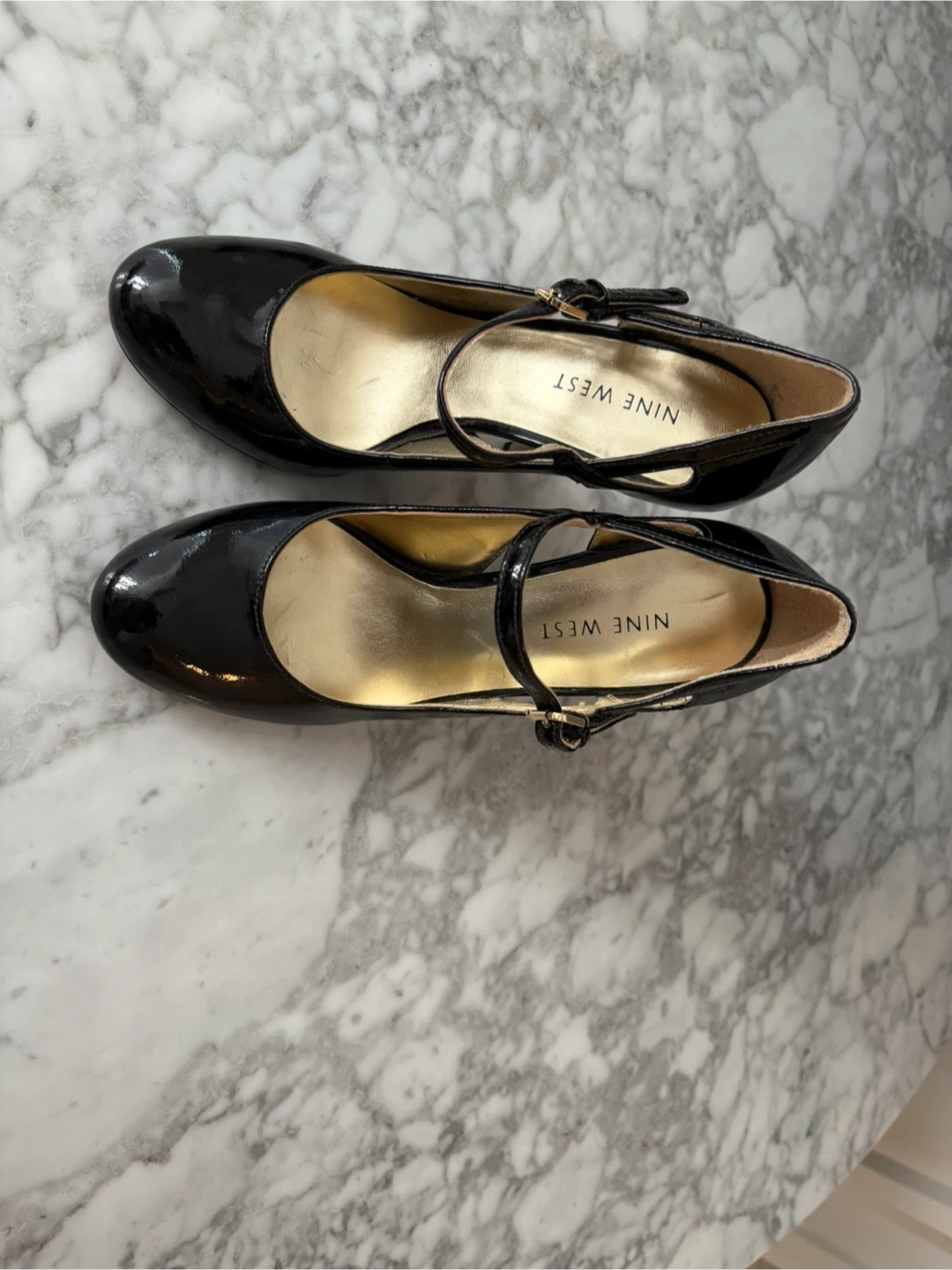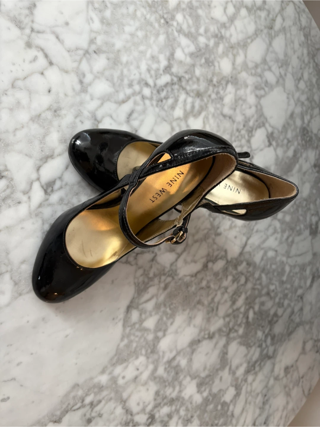 These are a pair of Nine West black patent leather heels in a size 5.