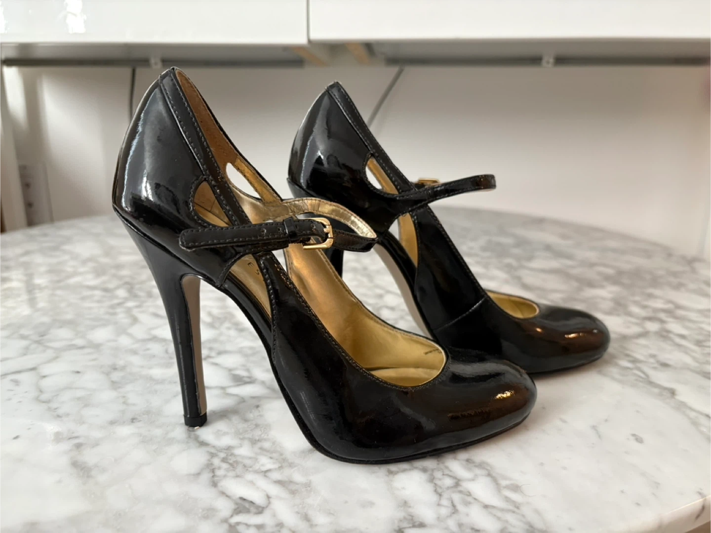 They feature a classic Mary Jane style with an ankle strap and a stiletto heel. They show some signs of wear on the soles, but the uppers are in excellent condition. Worn once at indoor. Perfect for adding a touch of elegance to any outfit!