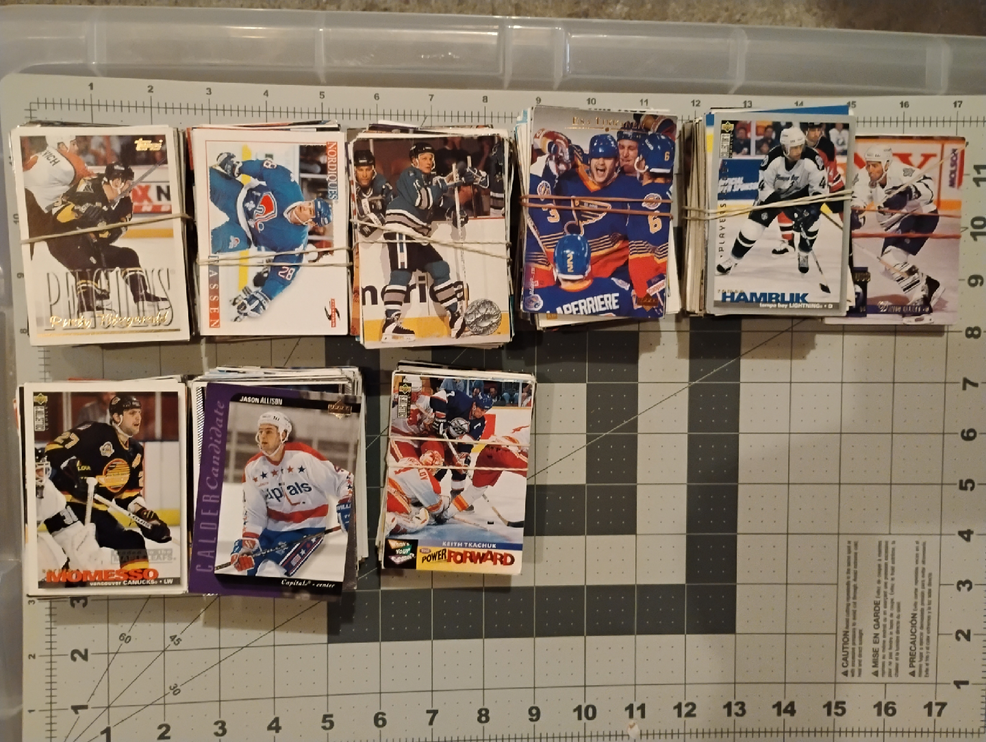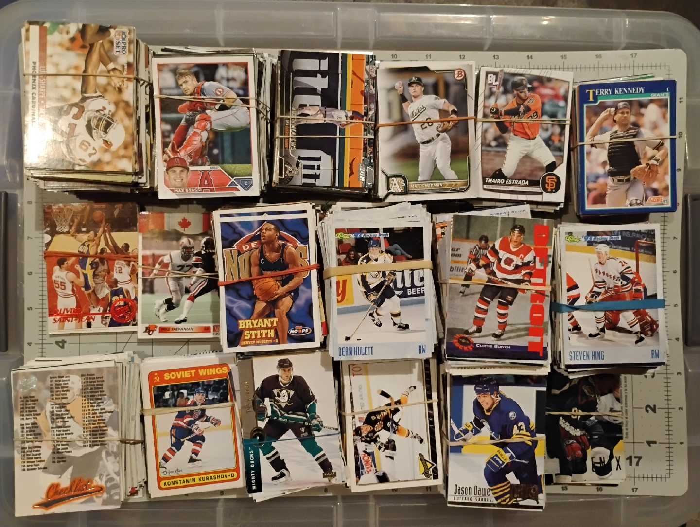 Included is the bonus lot of sport cards. They are nearly all hockey with some basketball, football, and baseball too. They are nearly all from the 90s and are common cards. Great for nostalgia and enjoying, and to use as placeholders in your frame