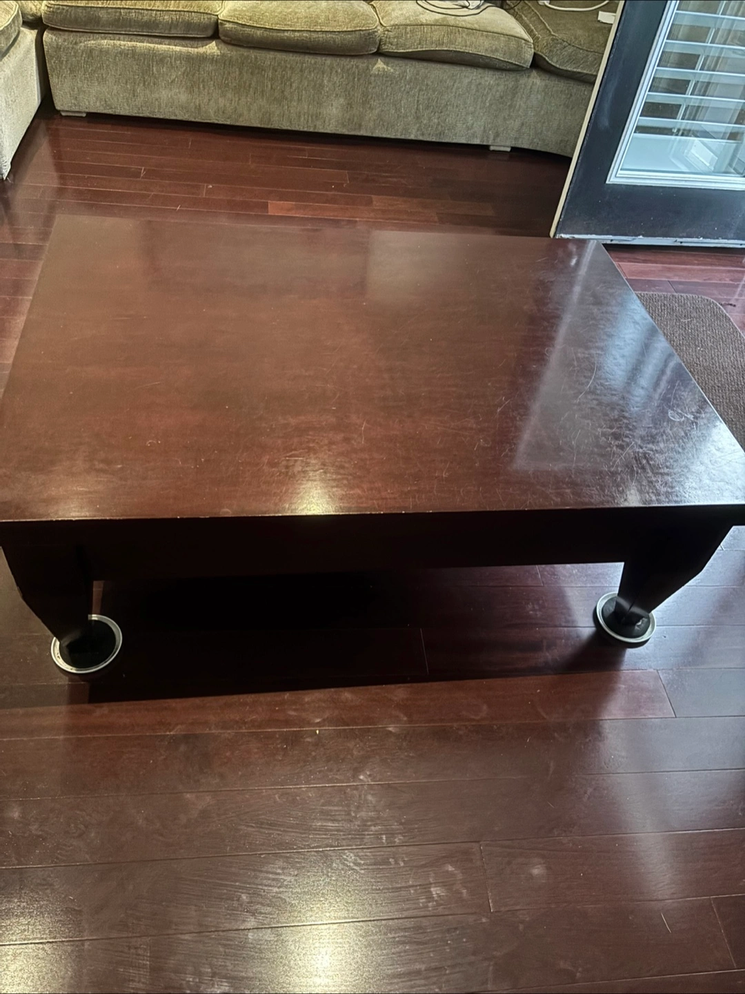 Here's a dark brown wood coffee table. It has a full lengthwise drawer for storage. There are some scratches on the legs but otherwise in good condition. Must be picked up next Tuesday. Cash and serious buyers only.