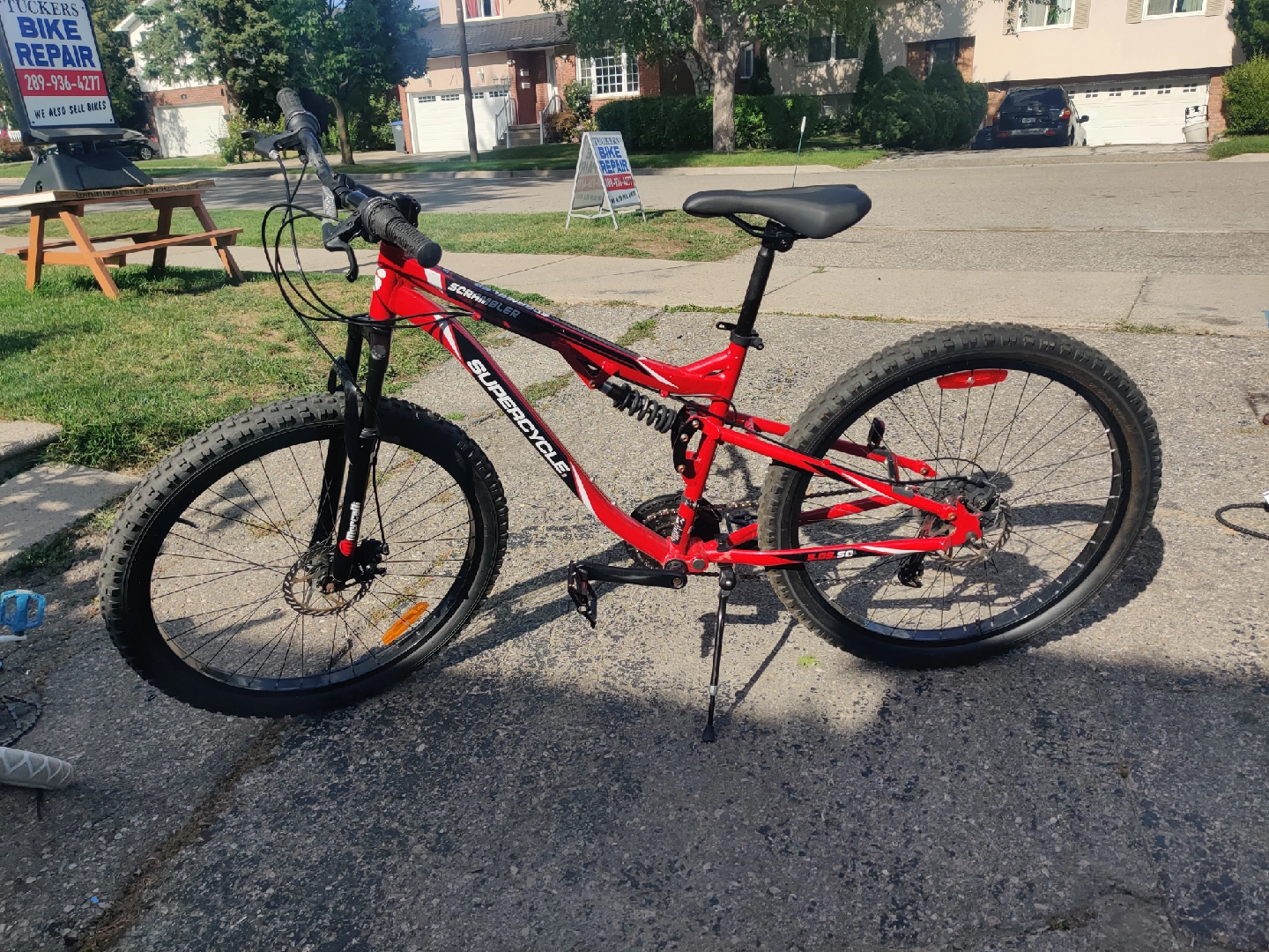 Selling a Supercycle Scrambler mountain bike in red and black. It's ready for some off-road adventures! The bike appears to be in good used condition and has a sturdy frame. Perfect for hitting the trails or cruising around the neighbourhood . new parts have been put on it.