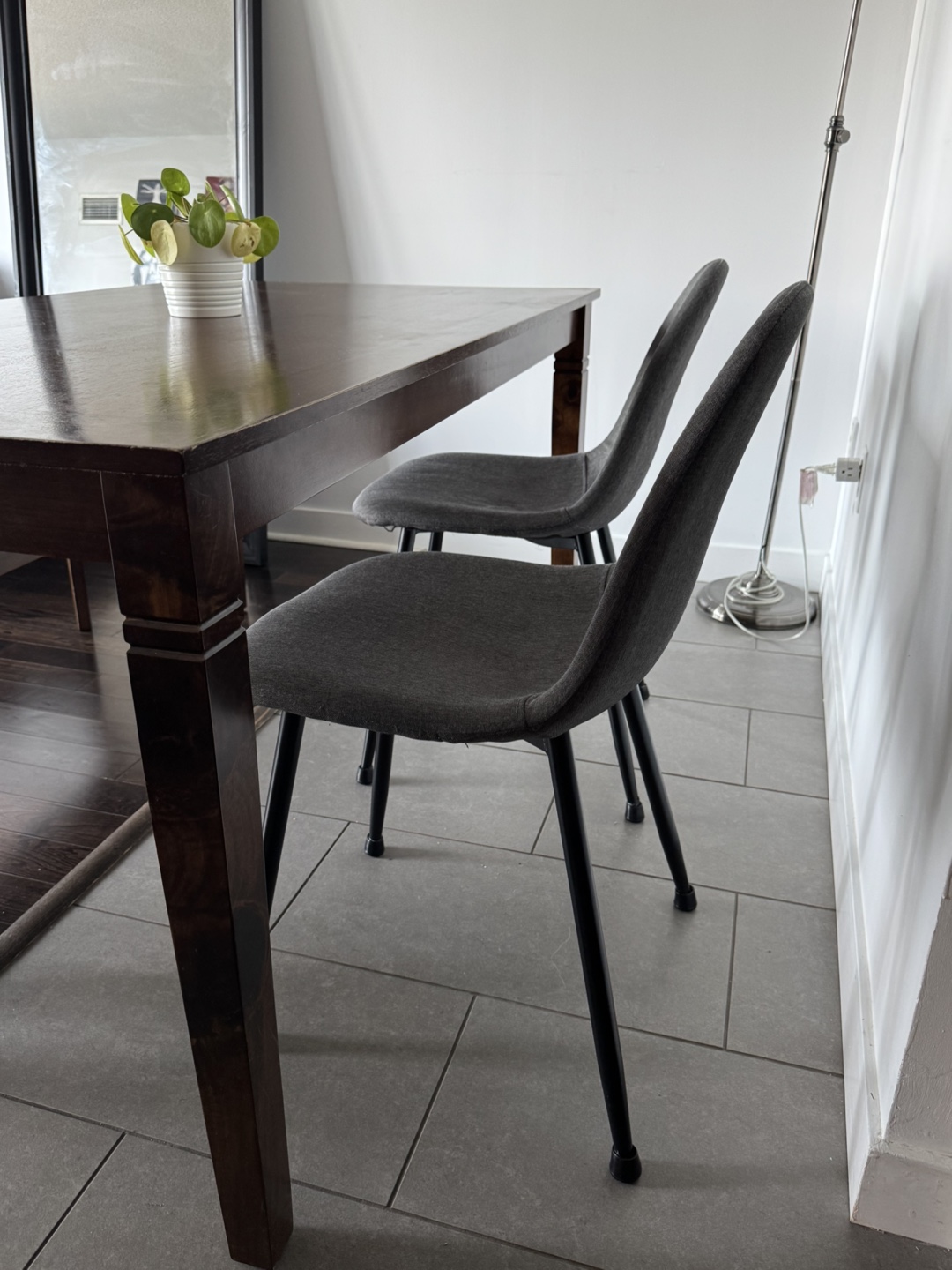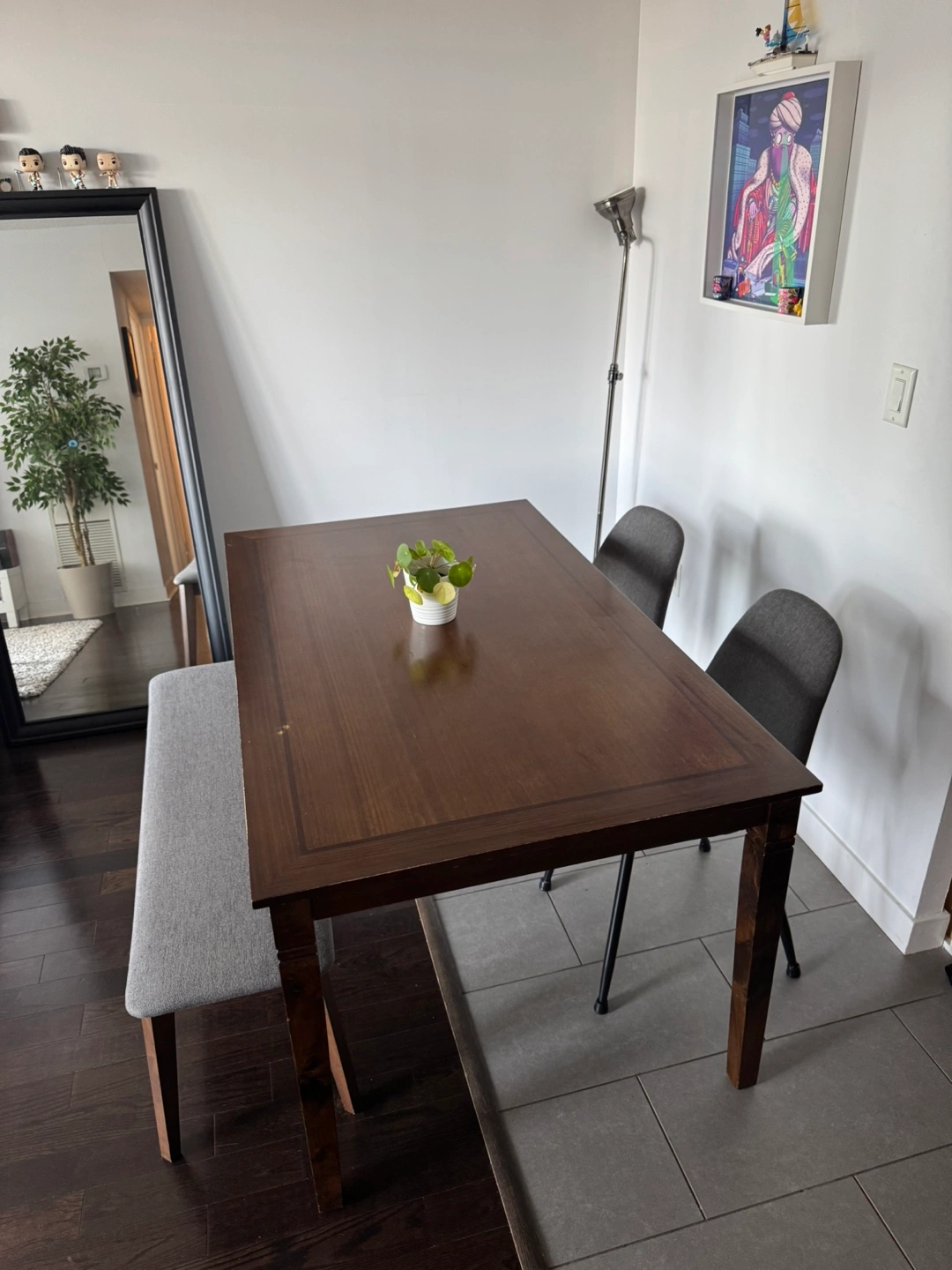 Selling a dining table with a bench and two chairs.