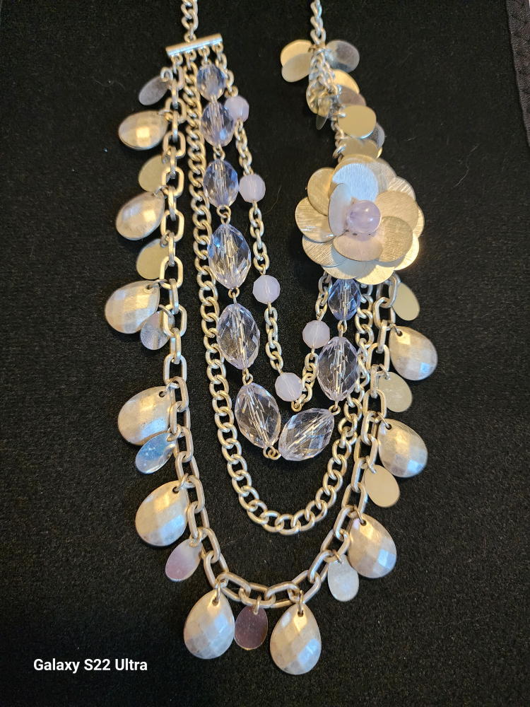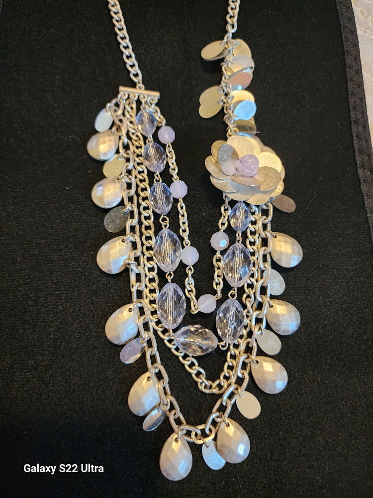 This is a fashionable necklace with silver and lavender accents. It features multiple strands of different chain styles, along with silver flower and teardrop shaped pendants.