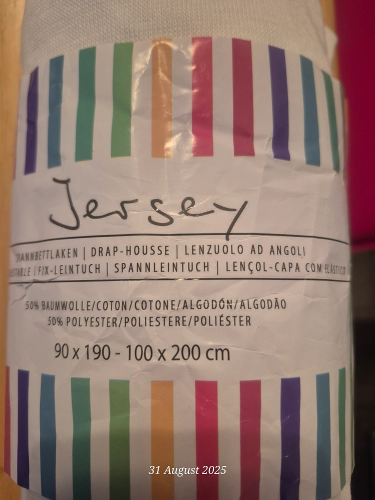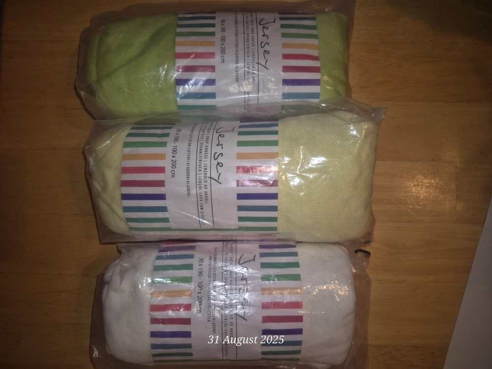 I'm selling 3 brandnew jersey fitted sheets! They're made of 50% cotton and 50% polyester, and they fit mattresses sized 90x190 cm to 100x200 cm.