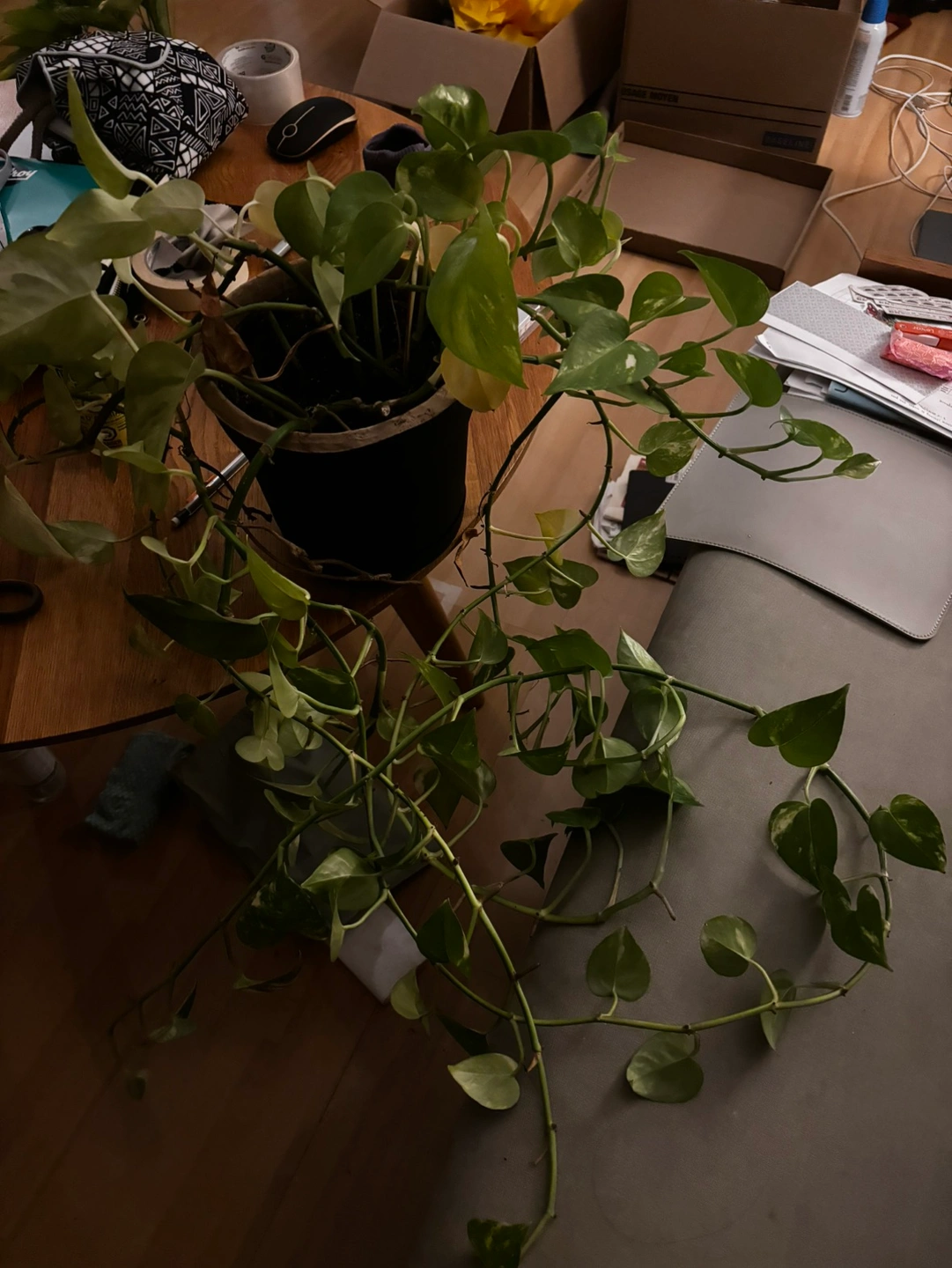 Growing long pothos for sale - easy to take care of! Comes with pot that has a drainage tray.