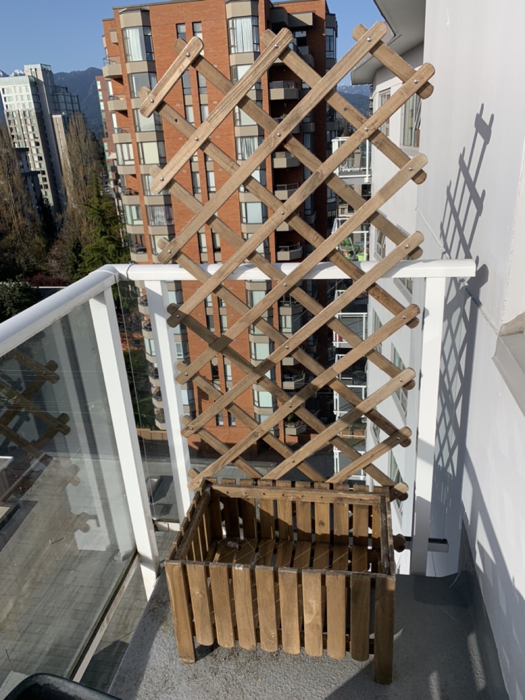 Wooden planter box with attached lattice. Condition marked as fair for the visual state as its been outside over a few winters. A coat of stain would do wonders. Structurally it’s good.