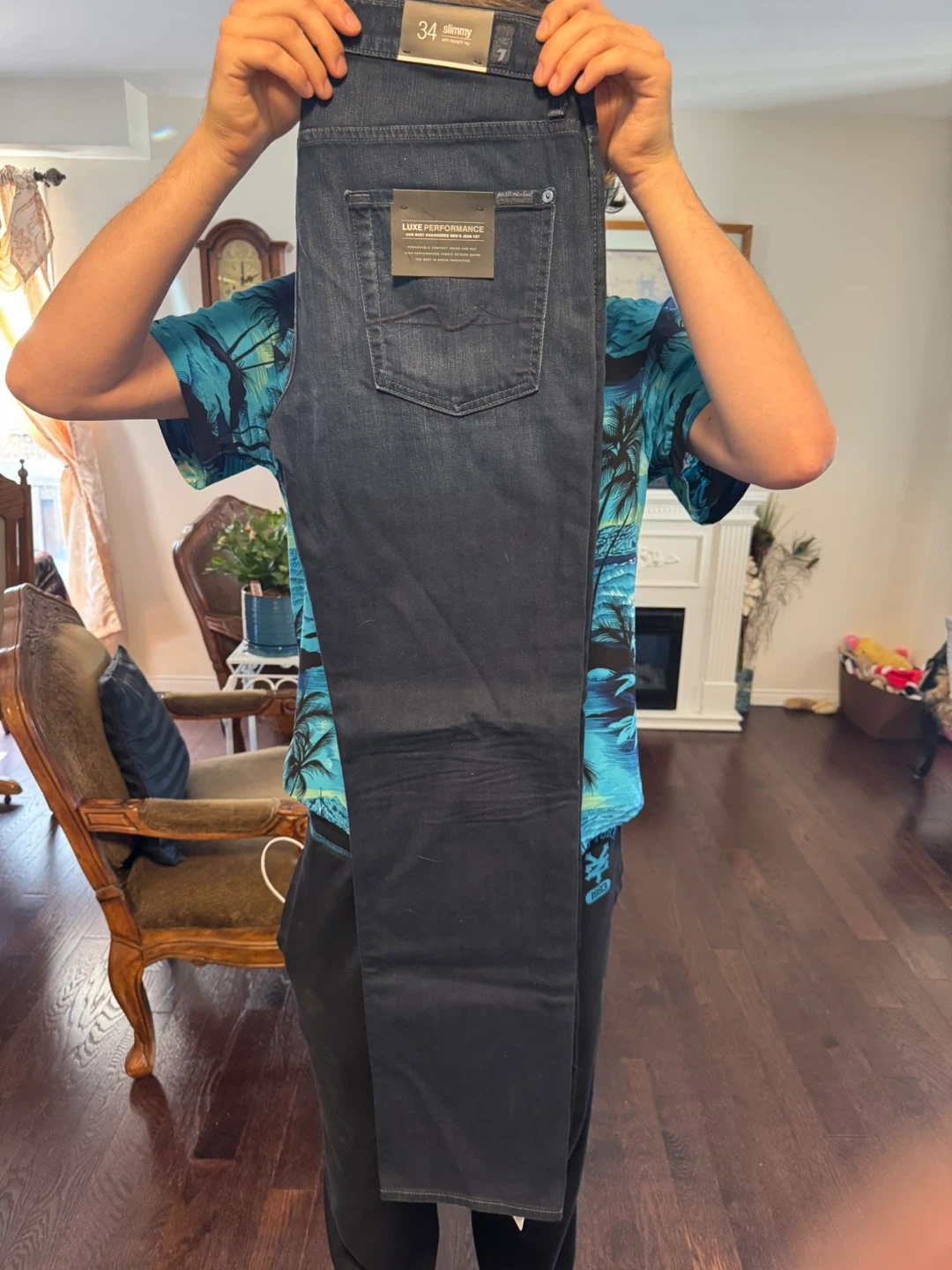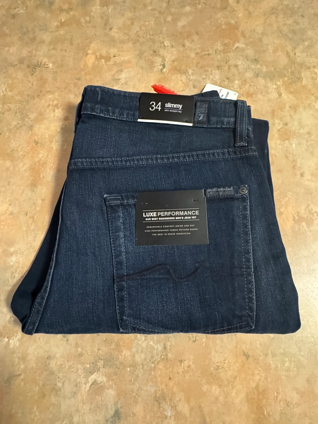 Selling a pair of 7 For All Mankind Slimmy jeans in size 34. These jeans feature a luxe performance denim that offers remarkable comfort inside and out. They have high-performance fibres that hold their shape, making them the best in denim innovation