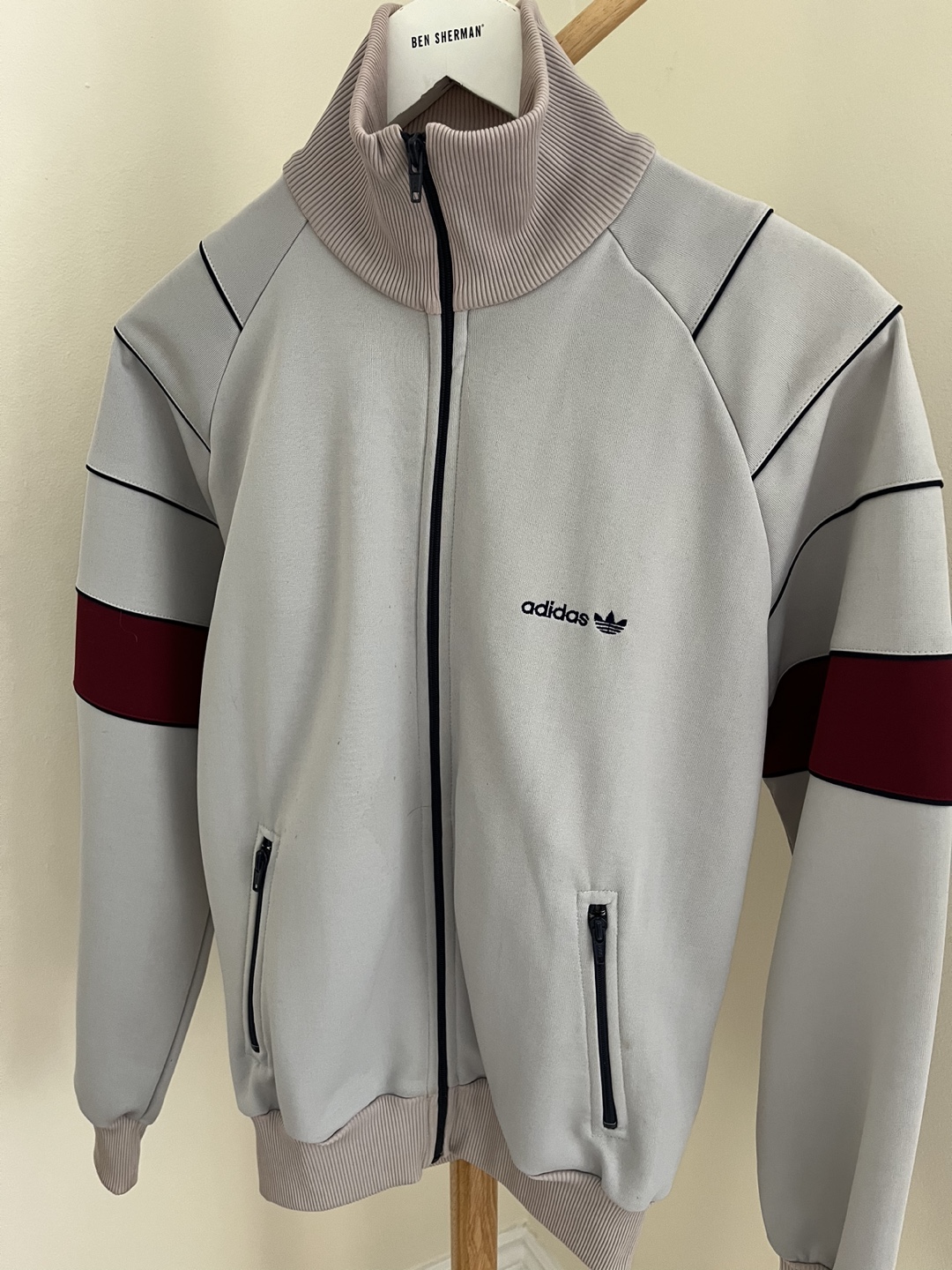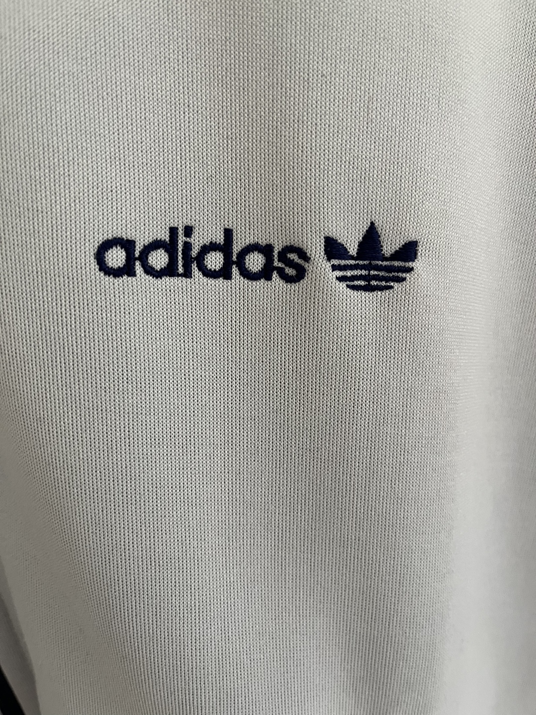 I'm selling a gently used vintage Adidas track jacket in size medium. It features the classic Adidas logo and a classic retro design. Ykk zipper