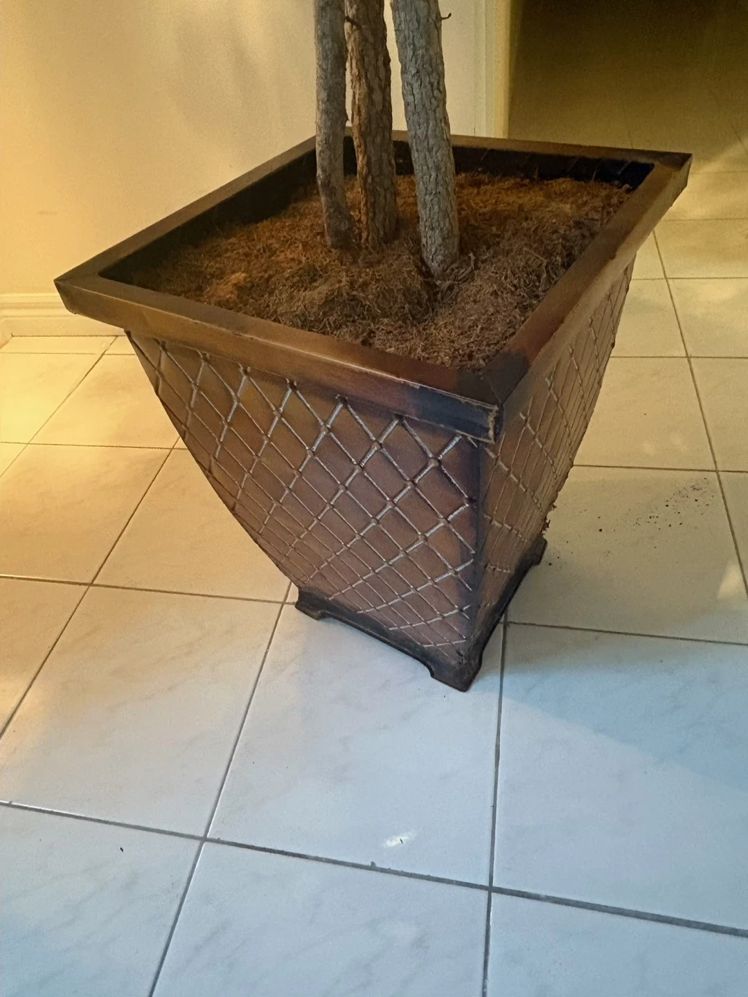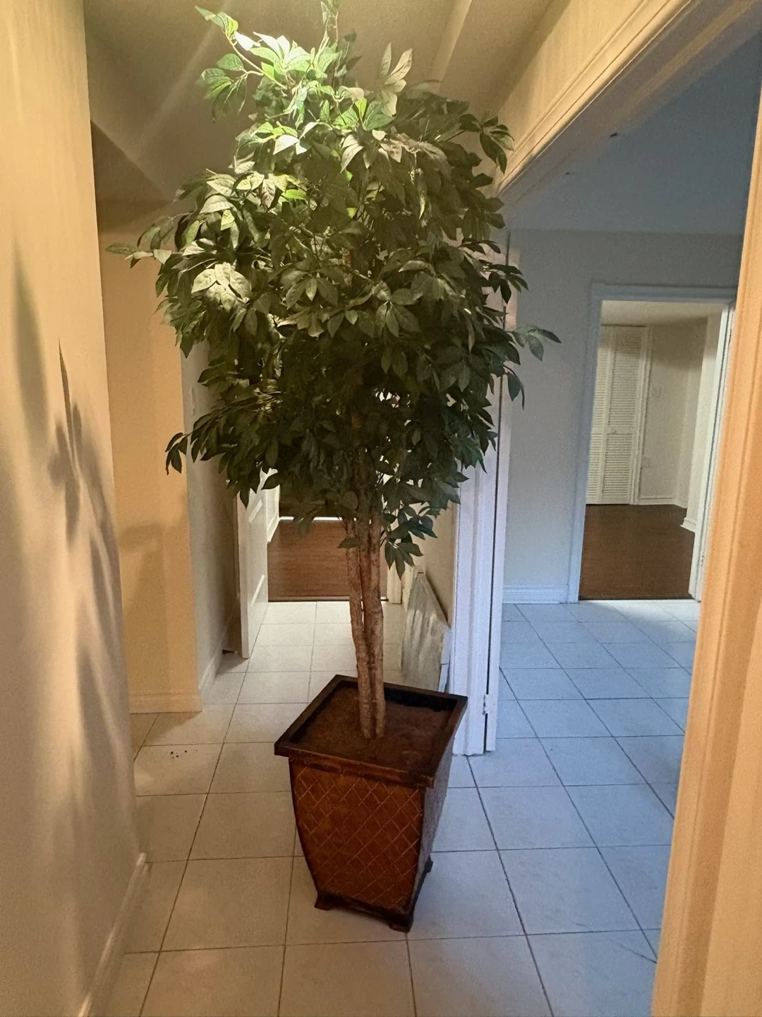 Artificial tall plant , Add some greenery to your space with this faux tree. It's housed in a decorative woven planter with a criss-cross pattern. The planter is a rich, dark wood tone. It's a nice size for a corner or entryway. There is damage on the corner of pot