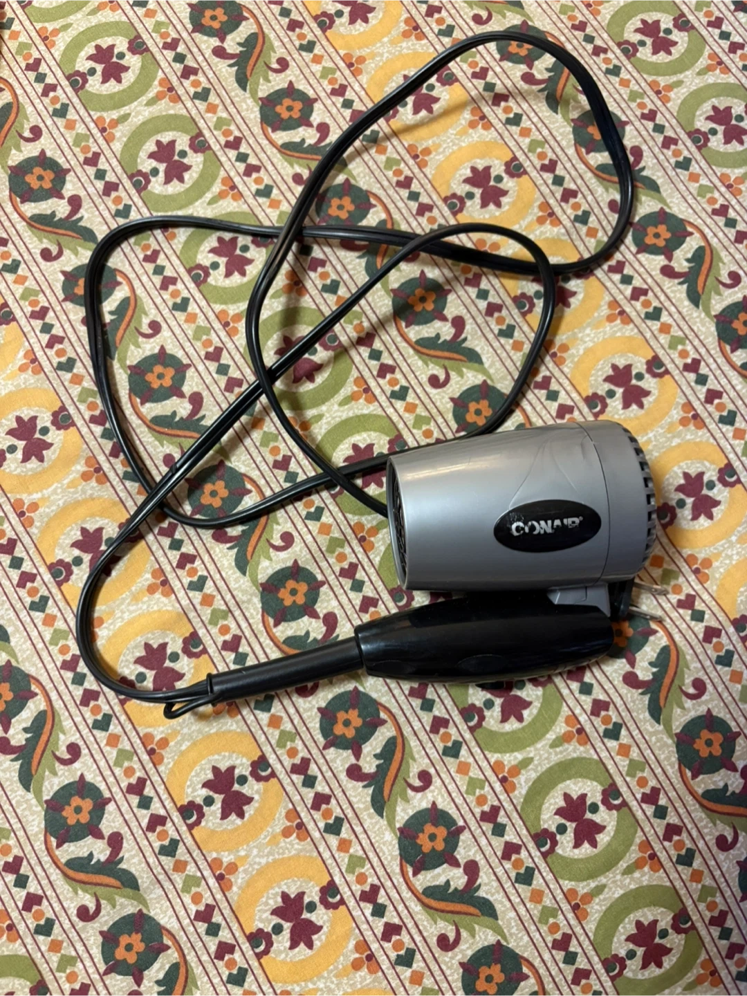 This is a Conair compact hair dryer. It's silver and black with a black cord. It's a handy size for travel or everyday use!