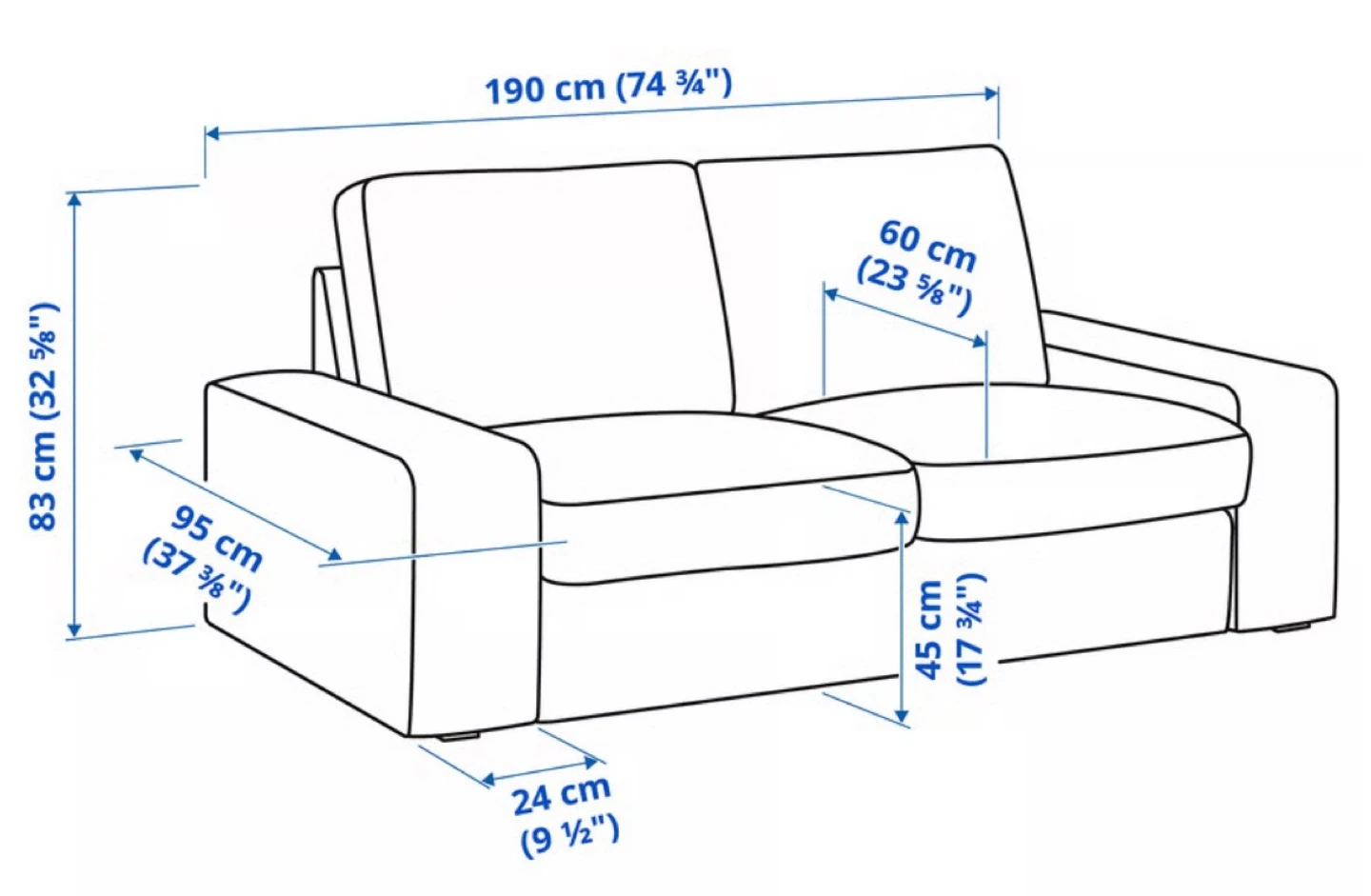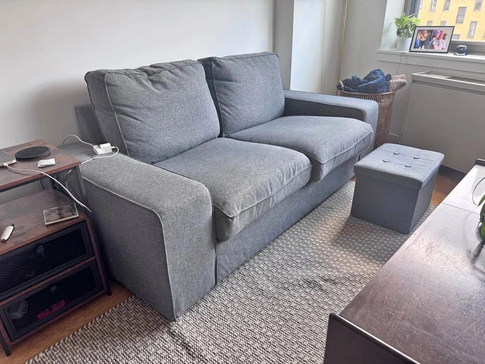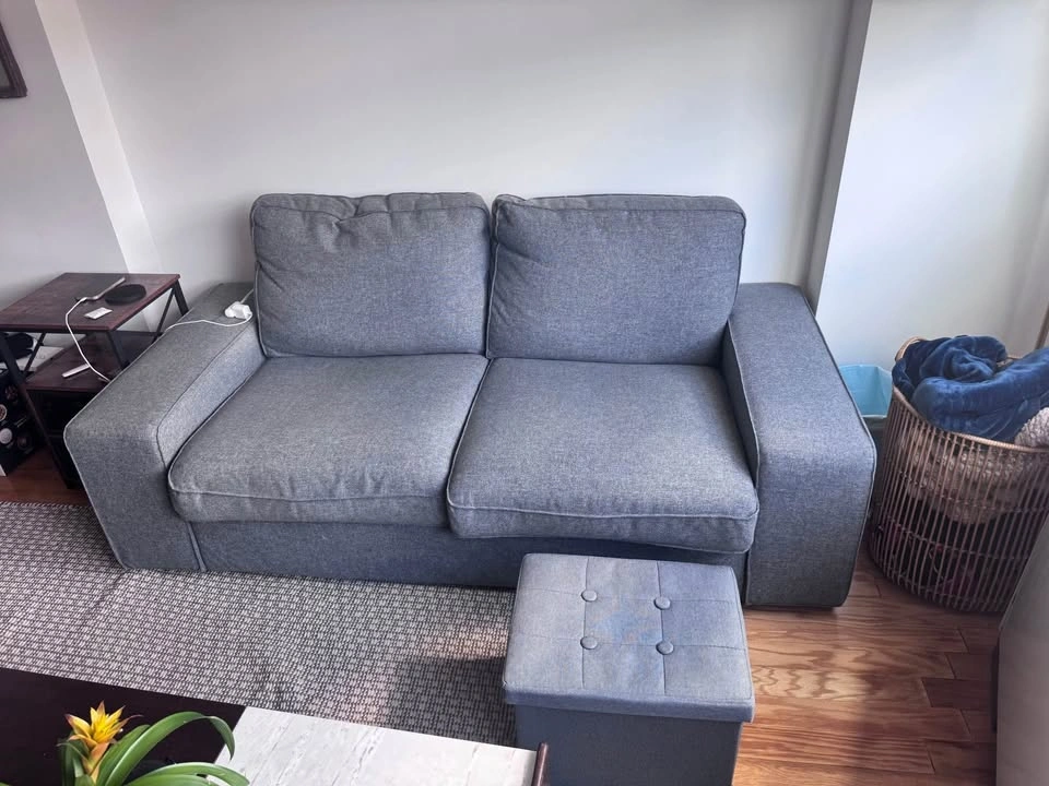 One year old couch with no tears or issues of any kind. Just needed a bigger couch for my new apartment. Comes with collapsible ottoman (shown in photos) available for pick-up starting 9/8. Dimensions in last photo.