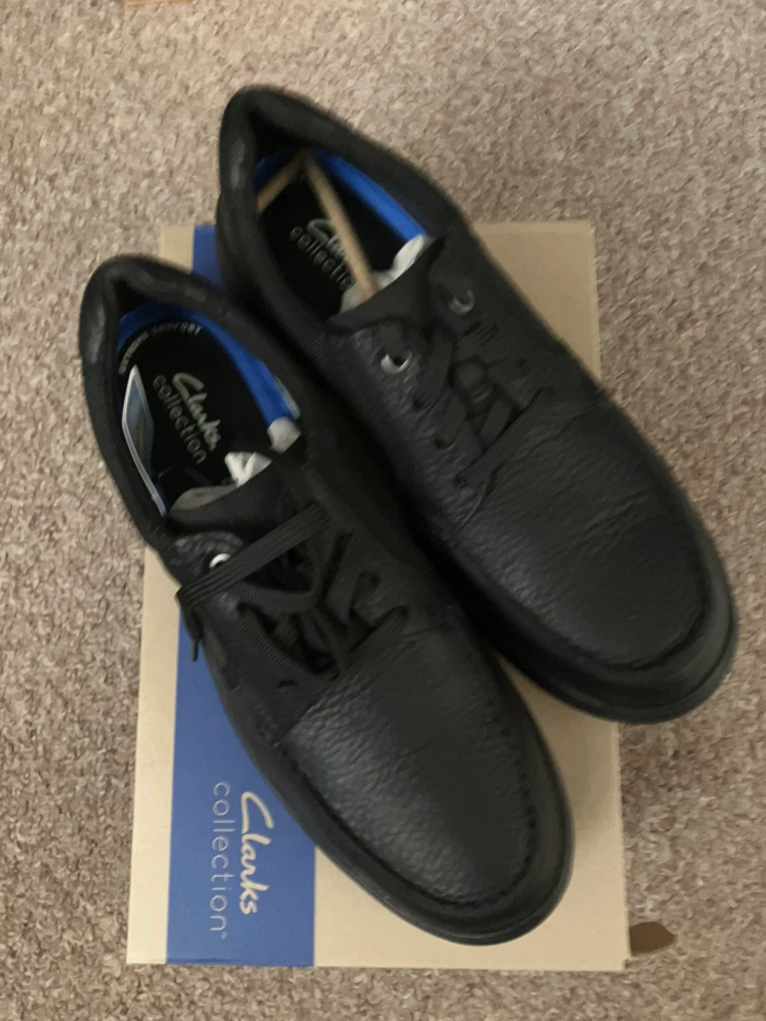Selling a pair of Clarks Collection men's shoes! They are black leather and come with the original box. Great for everyday wear!