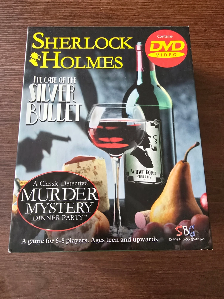 Selling the Sherlock Holmes Murder Mystery Dinner Party game! It's a classic detective game for 6-8 players, ages teen and upwards. Includes a DVD video to help you solve the case of the silver bullet!