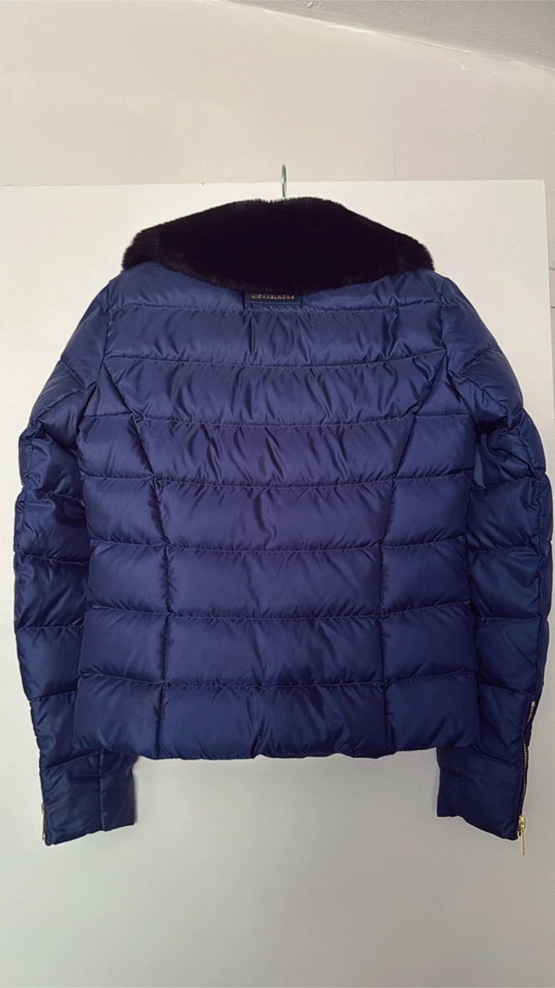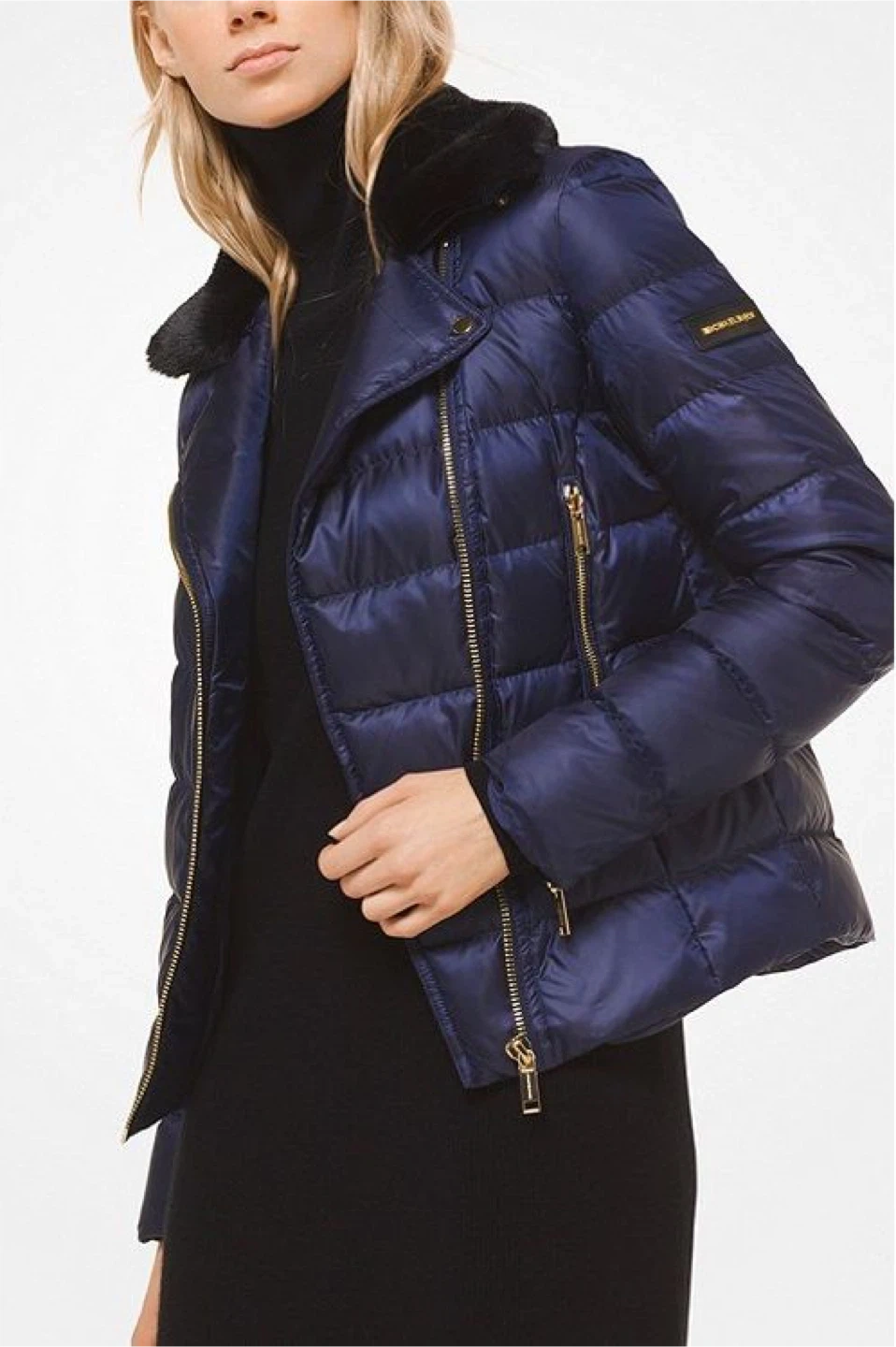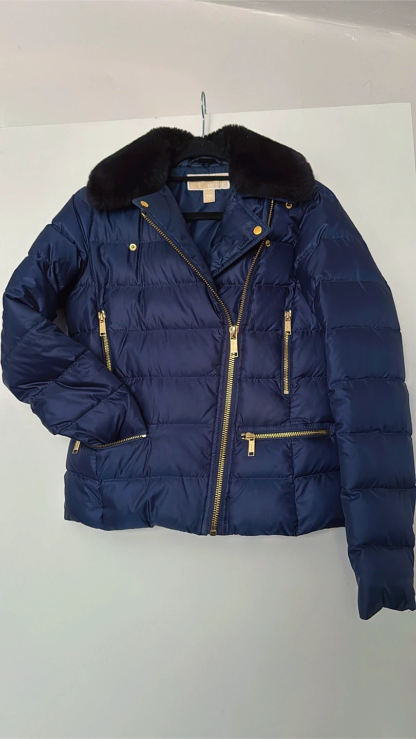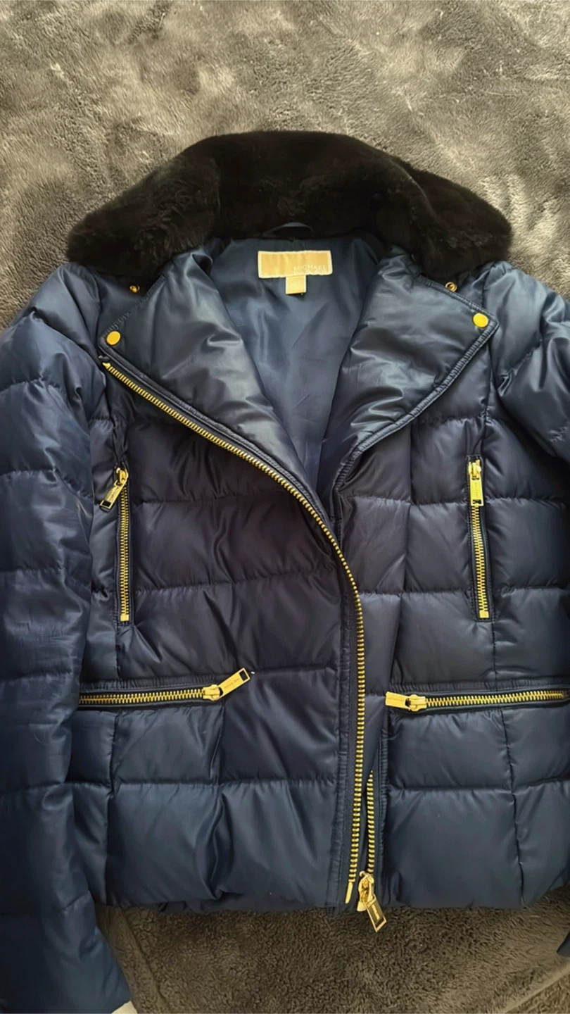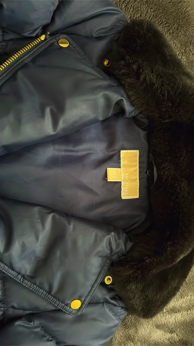Stylish Michael Kors puffer jacket in a beautiful navy color! It features a faux fur collar for added warmth and style. Perfect for staying cozy and fashionable during colder weather