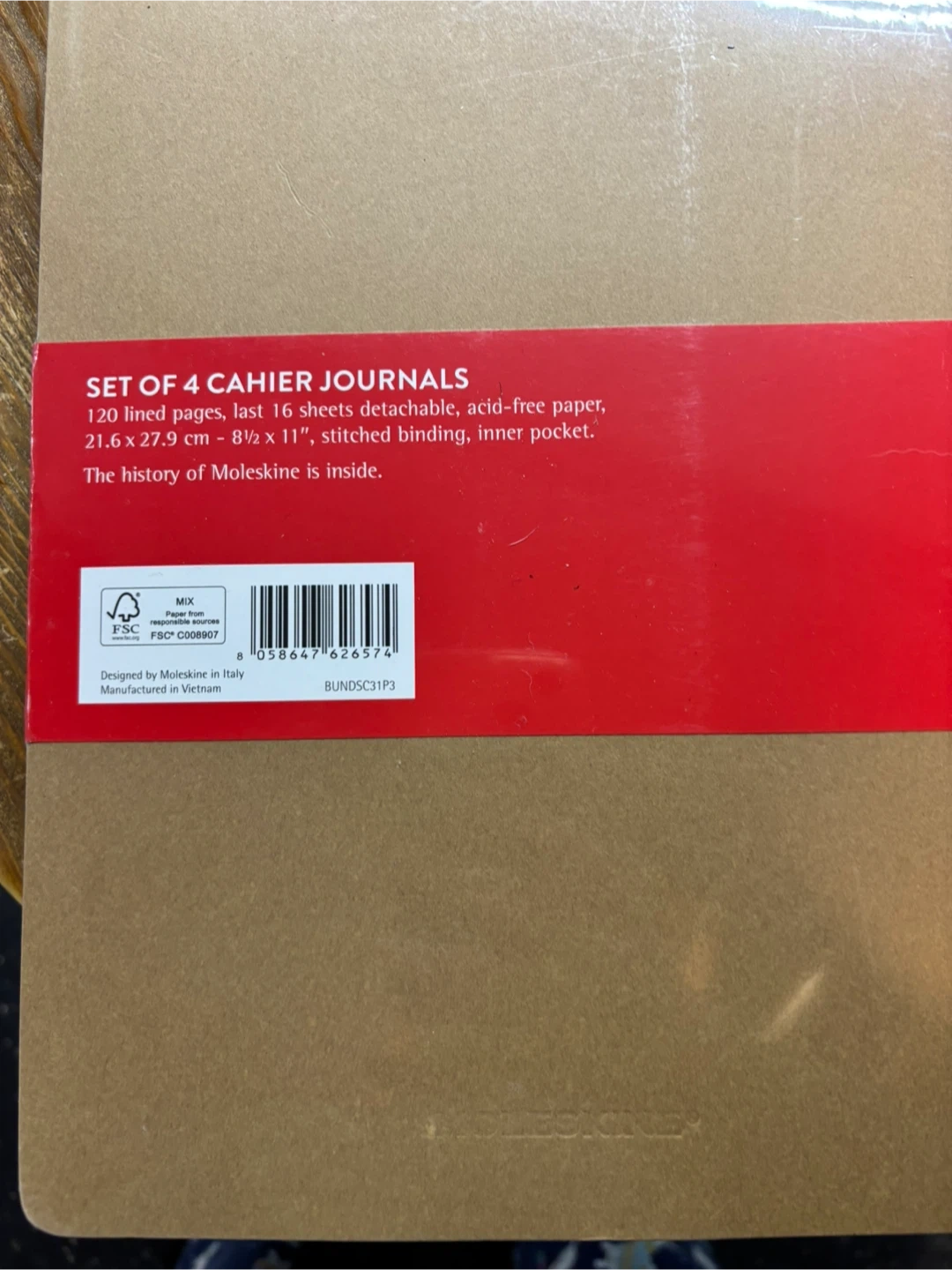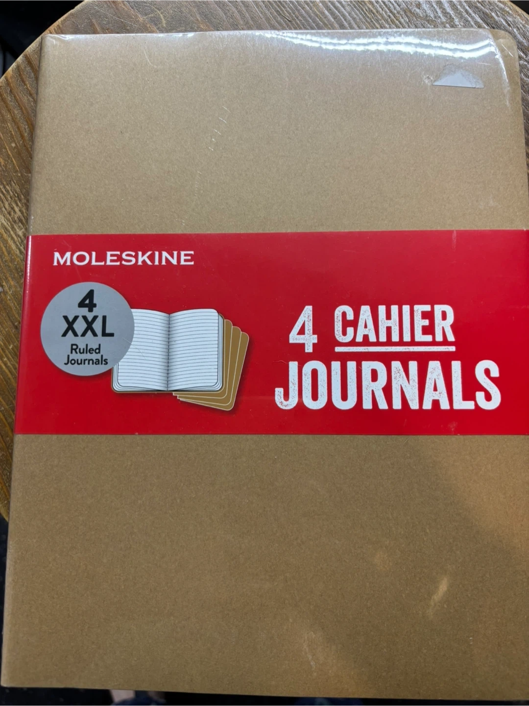 Selling a pack of Moleskine Cahier Journals. This set includes 4 XXL ruled journals, perfect for all your writing needs! Each journal has 120 lined pages, with the last 16 sheets being detachable. The paper is acid-free, and the journals feature stitched binding and an inner pocket. Dimensions are 21.6 x 27.9 cm, or 8 1/2 x 11".