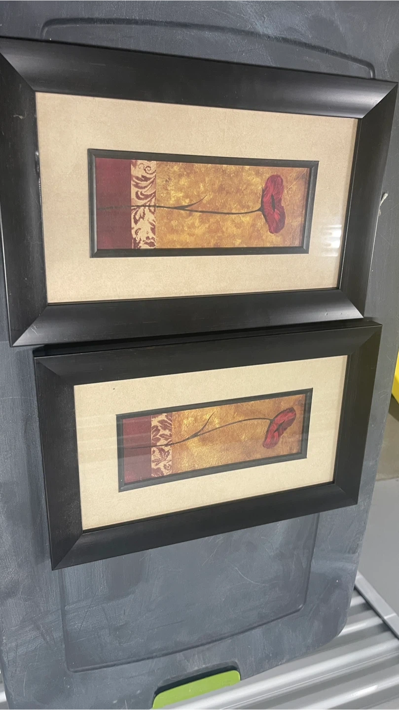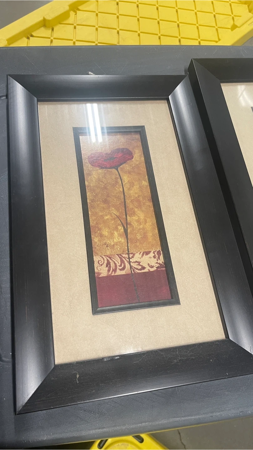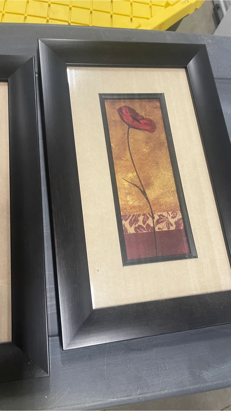Selling a set of two framed floral prints. They feature a simple yet elegant design with a red poppy on a gold and maroon background. The frames are a dark color. Perfect for adding a touch of nature to your home decor!
