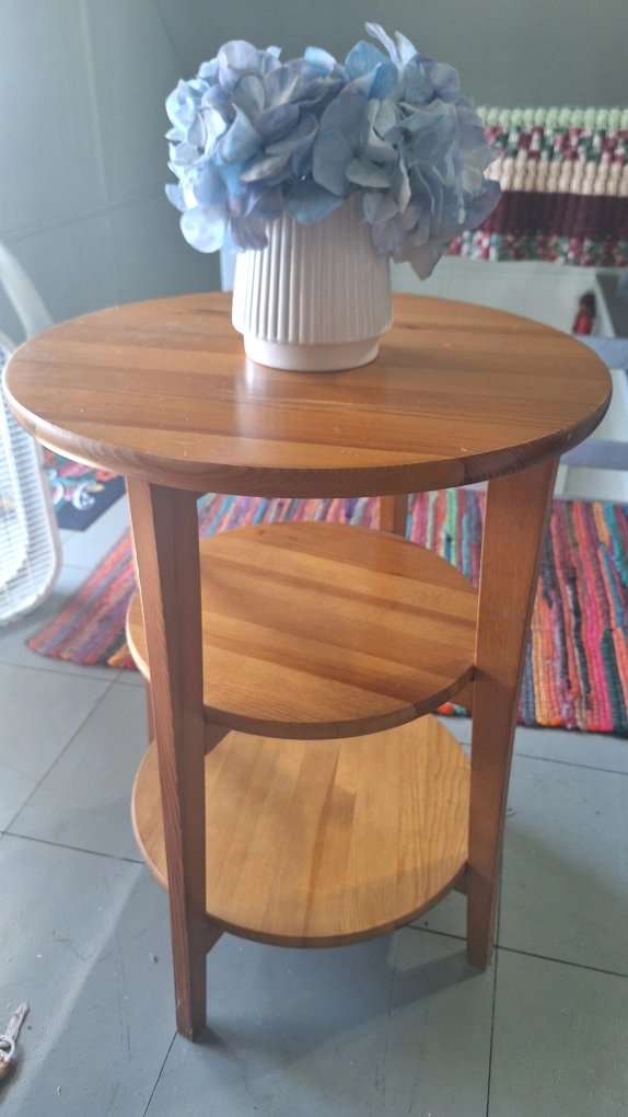 nice table for any room. 3 shelves all together. comes with pretty flower centerpiece