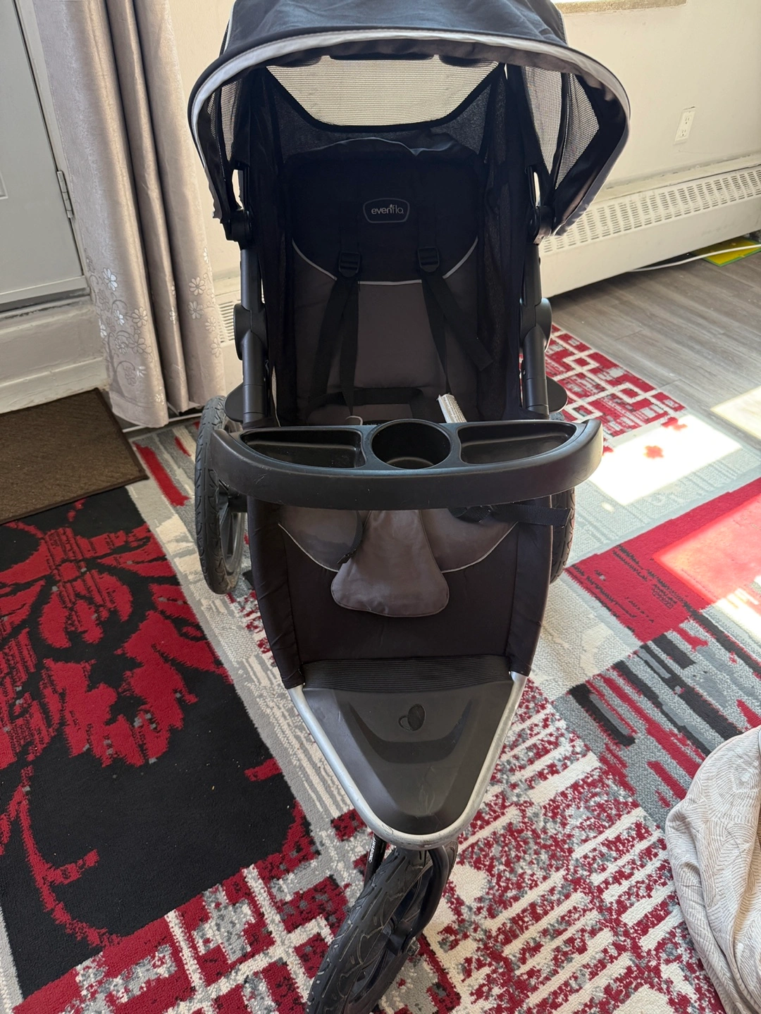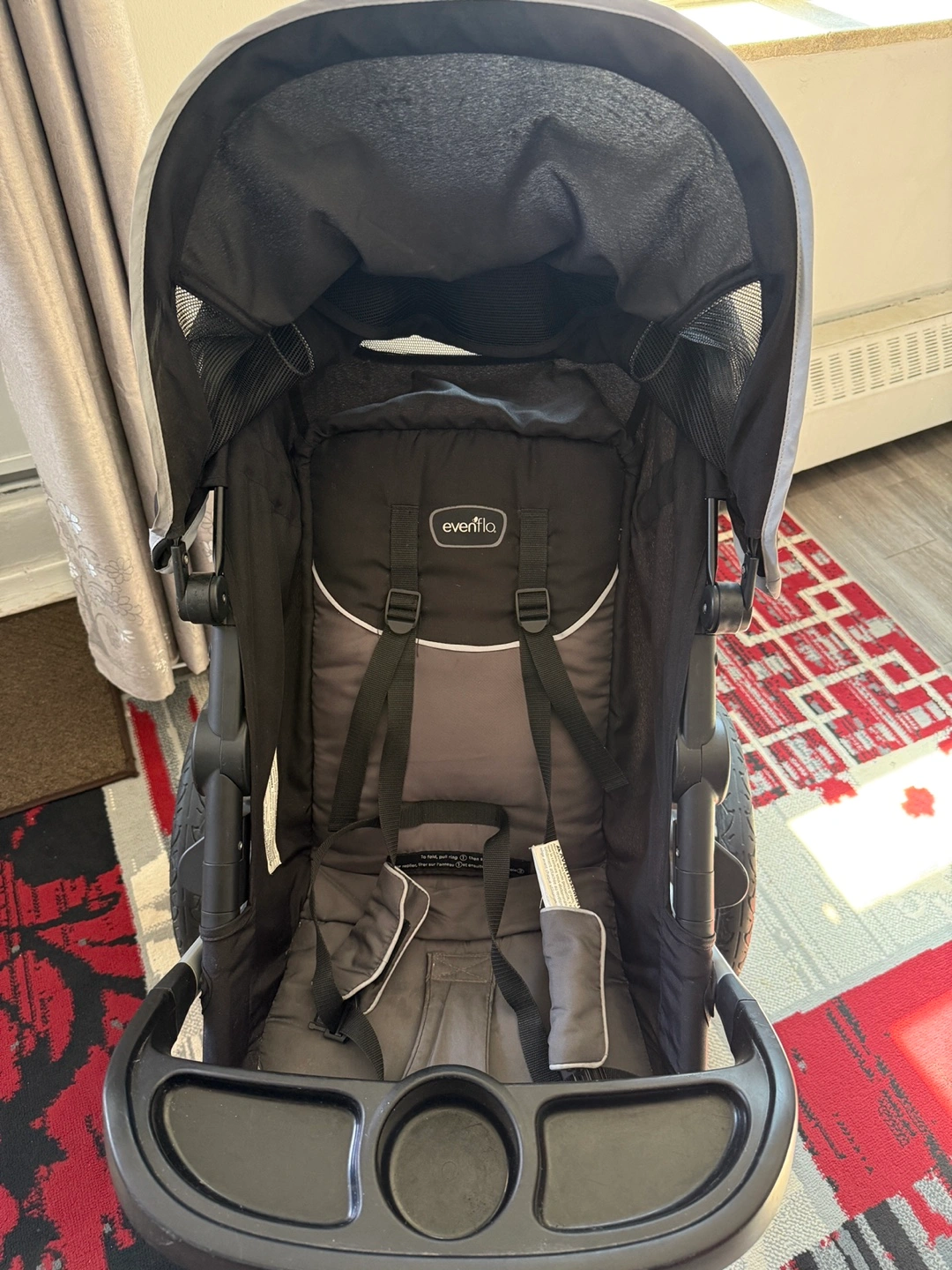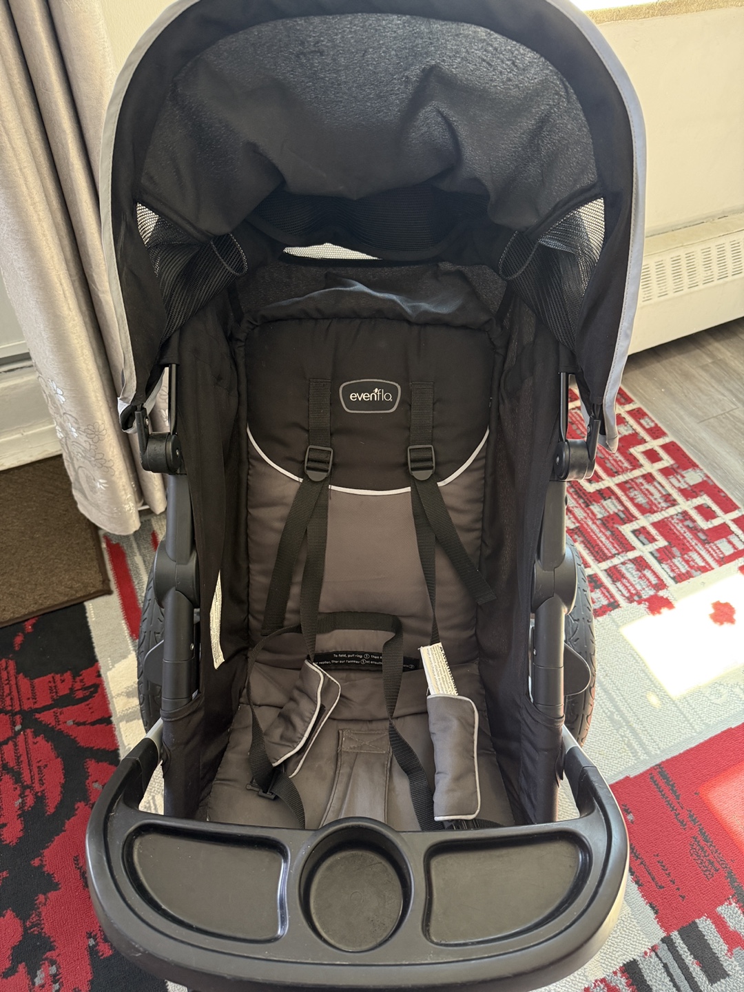 Selling an Evenflo stroller in great condition! It's perfect for taking your little one on walks around the neighbourhood. The stroller features a comfortable seat, a canopy to shield your child from the sun, and a convenient tray for snacks and drinks. It's a reliable and practical choice for parents on the go
