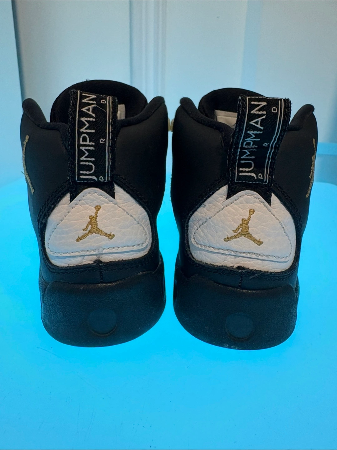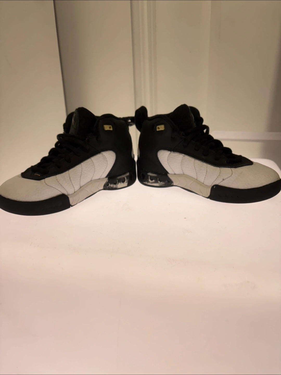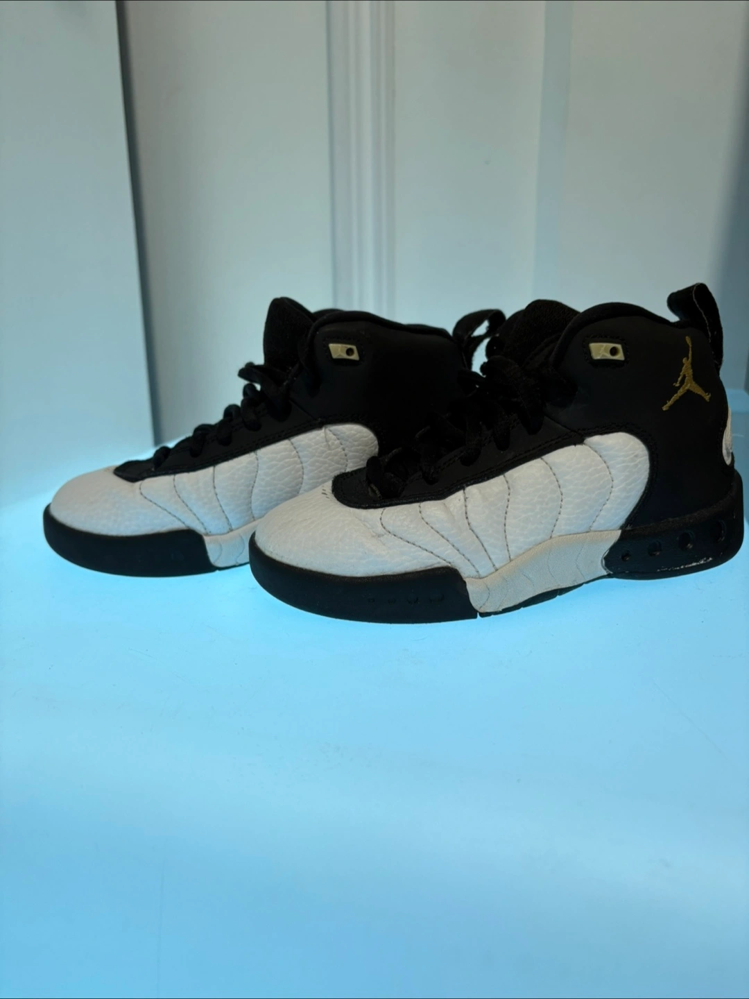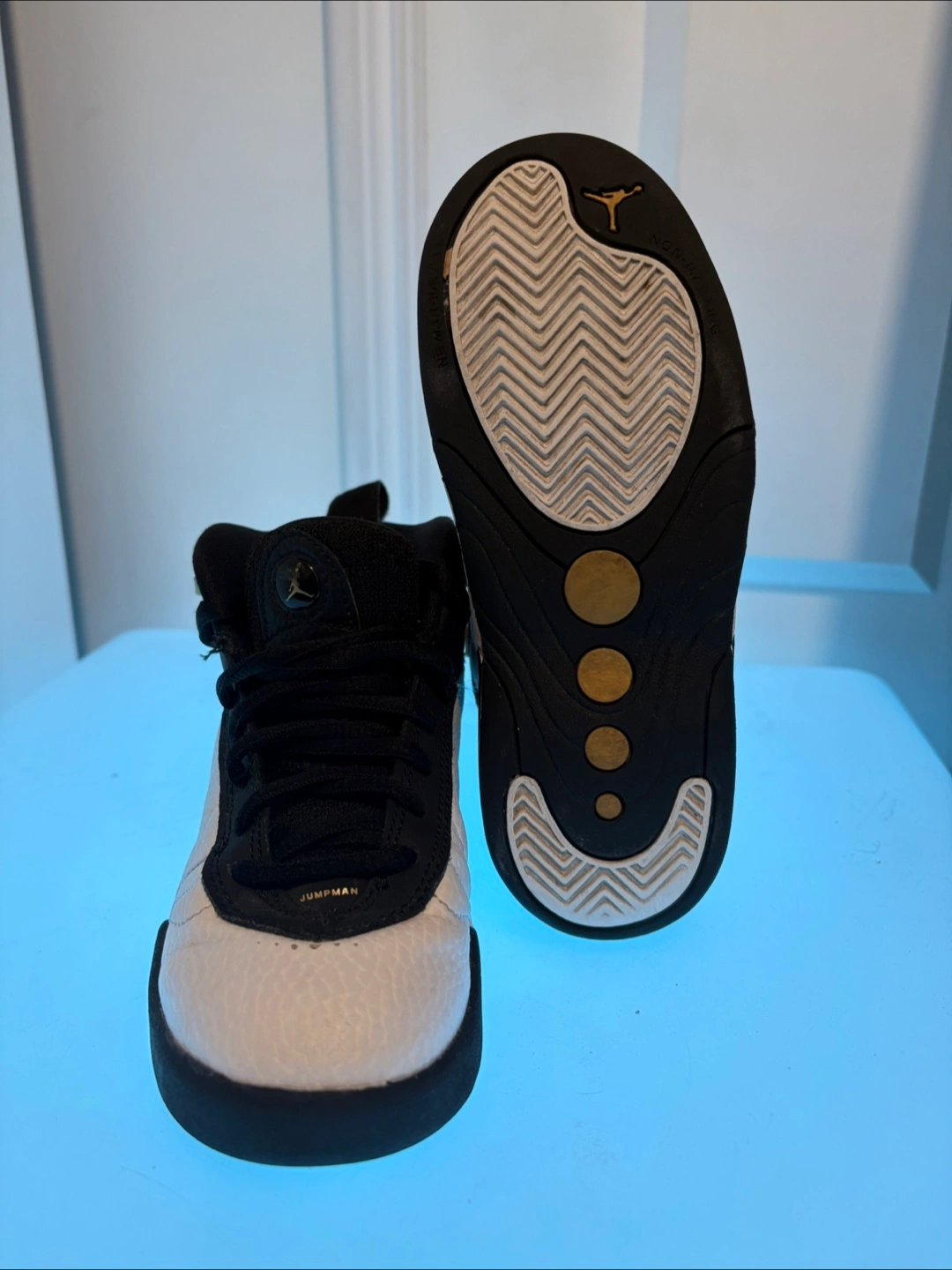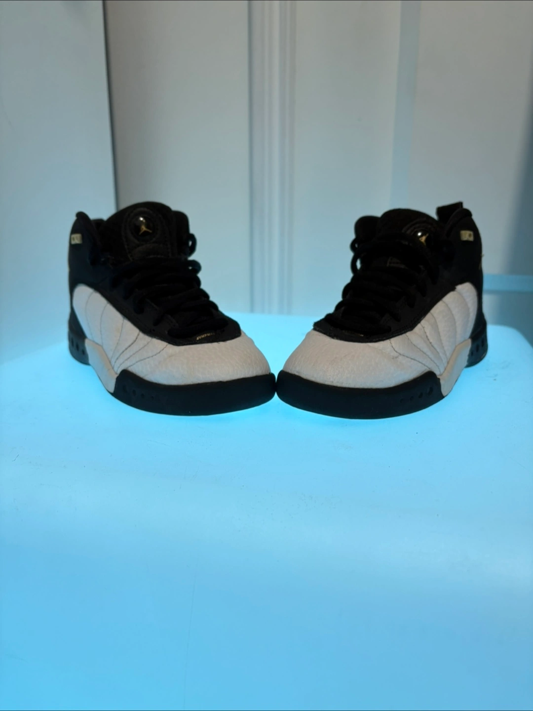Selling a pair of Jordan Jumpman Team 1 basketball shoes. They are size 12C, black and white and feature the Jumpman logo.
