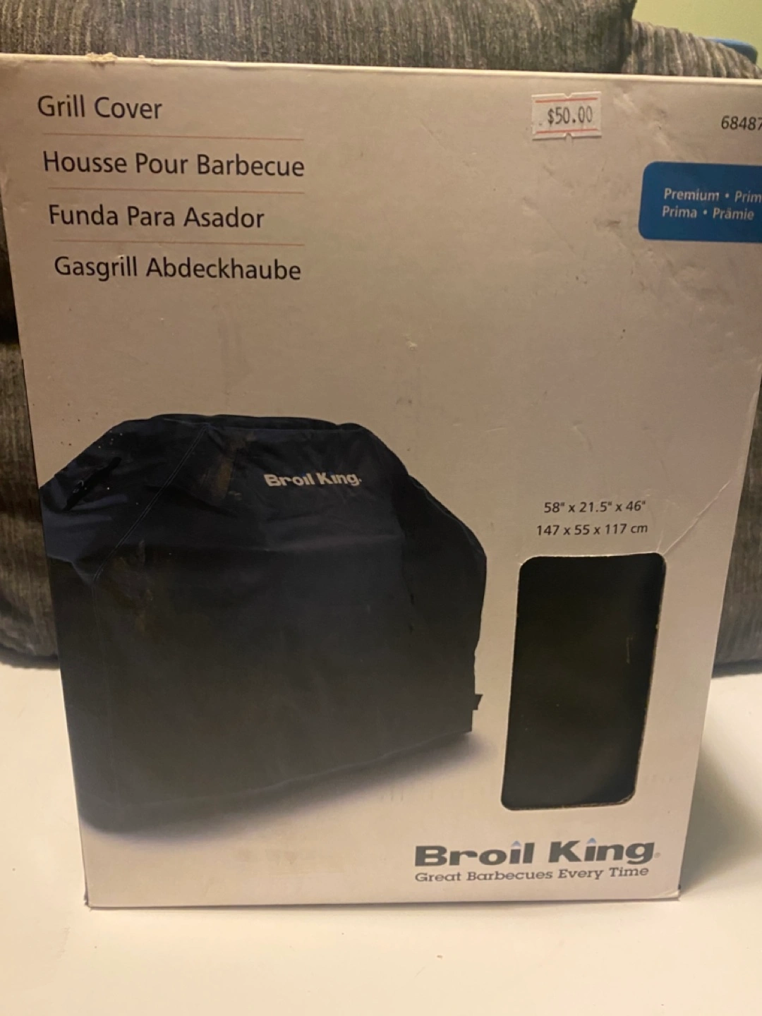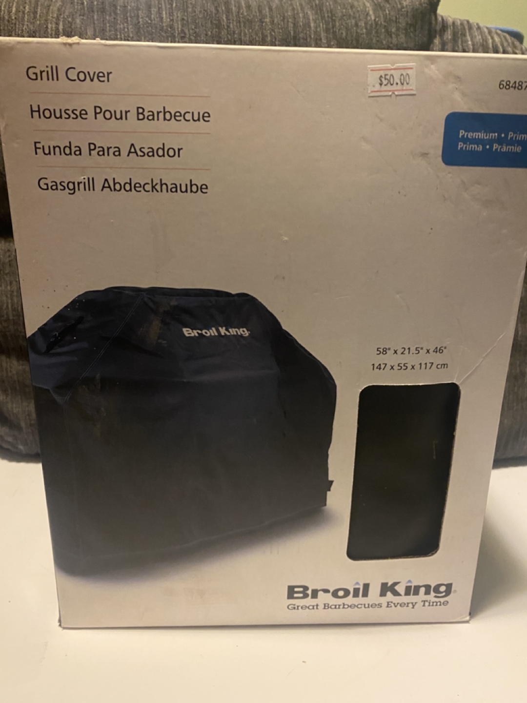 Selling a Broil King grill cover that fits the Baron 400 series, Signet 40/70/90 North America, Crown 10/90, Sovereign 20/70/90, and Crown 20/40/70 models. The cover is 58" x 21.5" x 46" (147 x 55 x 117 cm). Originally bought for $99.00, comes with original box. It is new.