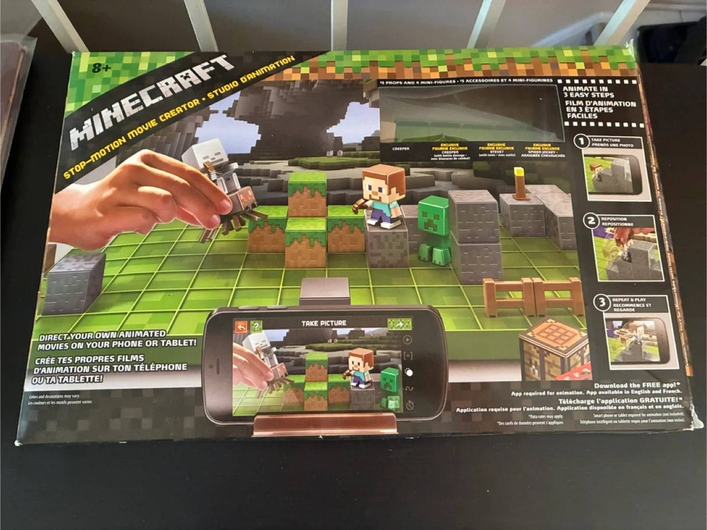 Selling a Minecraft play set. It comes with 16 props and 4 mini-figures, as well as 6 accessories. The Mattel movie-making app it was designed to work with is no longer available, as far as I can tell, but maybe another stop-motion movie app will work. If not, it’s a cute set.