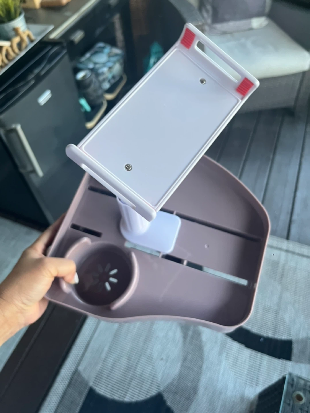 Selling a new pink adjustable hot tub table stand. Never used. It's in great condition and perfect for holding your tablet while you watch videos or work. It features an adjustable design to get the perfect viewing angle and a convenient spot for your drink!